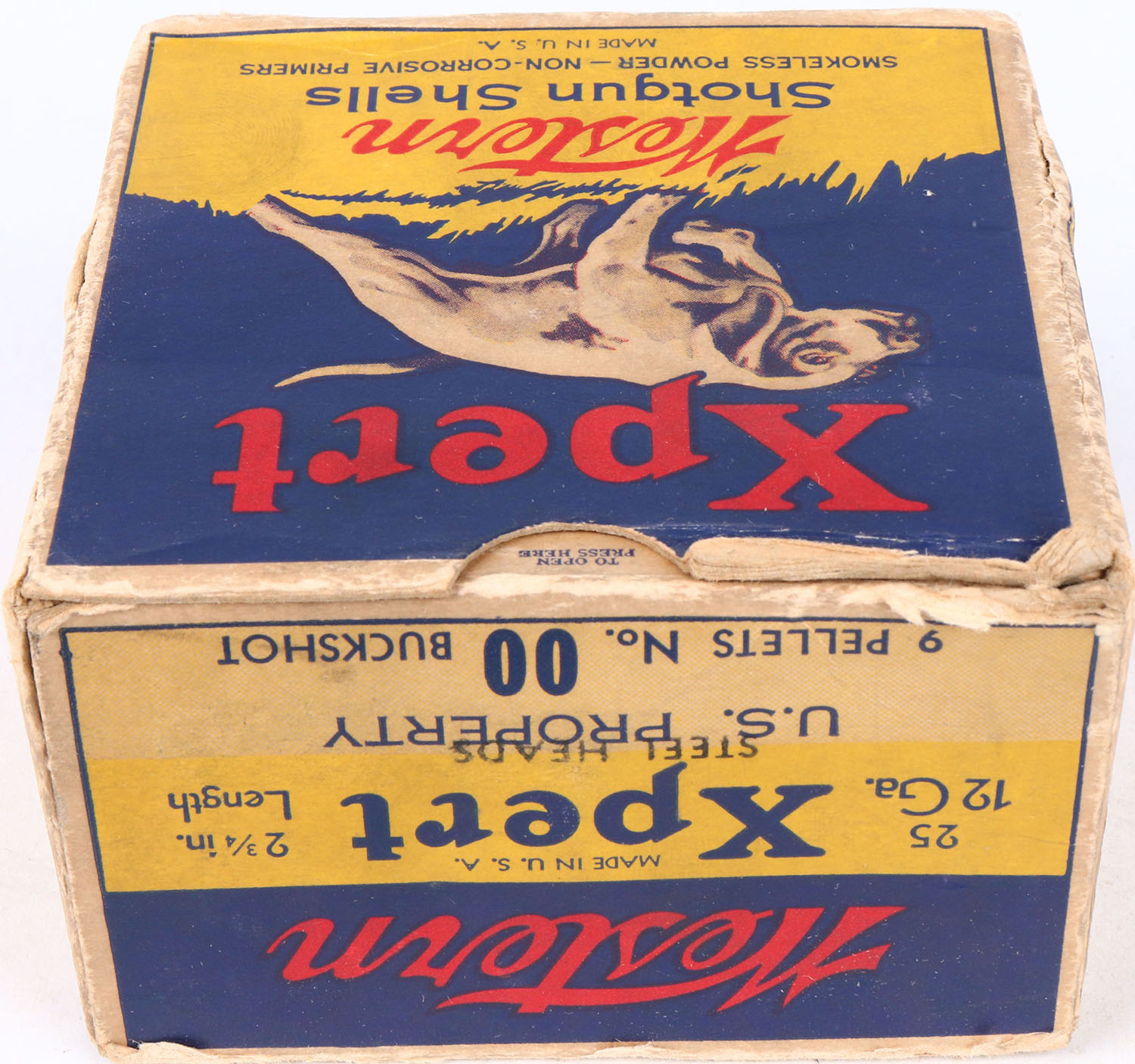 Western Cart. Co., Xpert, Steel Heads U.S. PROPERTY, 12ga., 1pc., FULL, blue, yellow & red box with a dog on point, Loading: 9 Pellets No. 00 BUCKSHOT, box has shell protrusions, edge wear and nice colors, ammo is excellent. Grade: Very Good ++ - Value: 40 to 100
