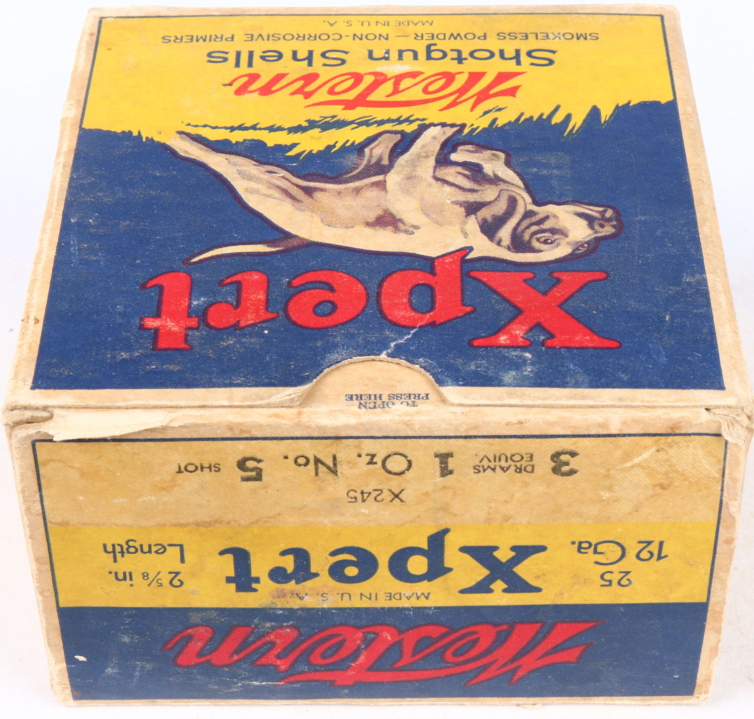 Western Cart. Co., Xpert, 12ga., 1pc., Full with 16 being correct brand, blue, yellow & red box with a dog on point, No. 5 Shot, box has light edge wear, light age soiling, & very nice colors, ammo is excellent. Grade: Very Good ++ - Value: 20 to 60