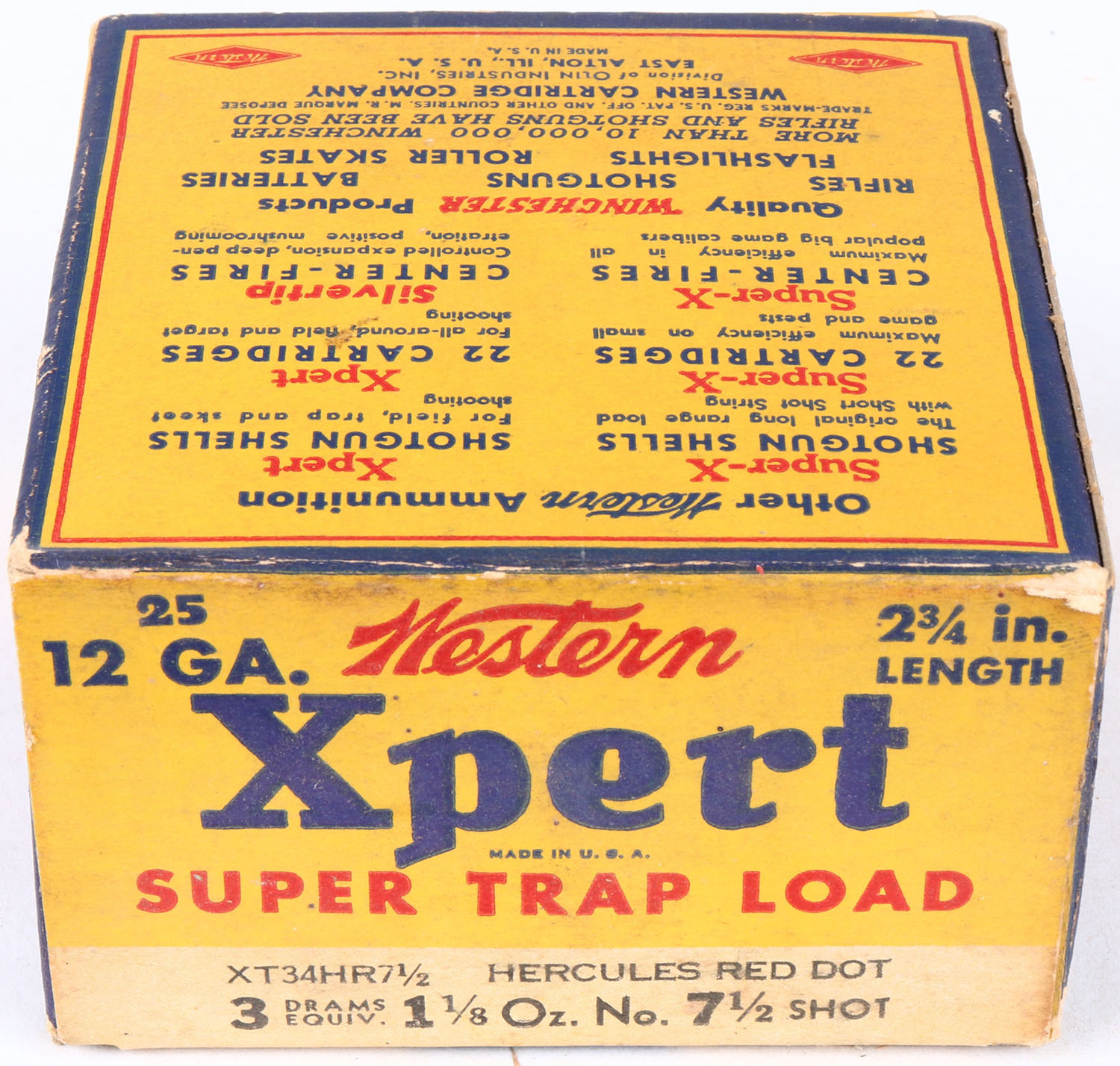 Western, Xpert Super Trap Load, 12ga., 2 3/4'', Hercules Red Dot, 1pc., Full of all incorrect shells, shot size 7 1/2, yellow, blue & red box, box is very solid with light soiling, and very nice colors, shells are excellent. Grade: Excellent + - Value: 10 to 30
