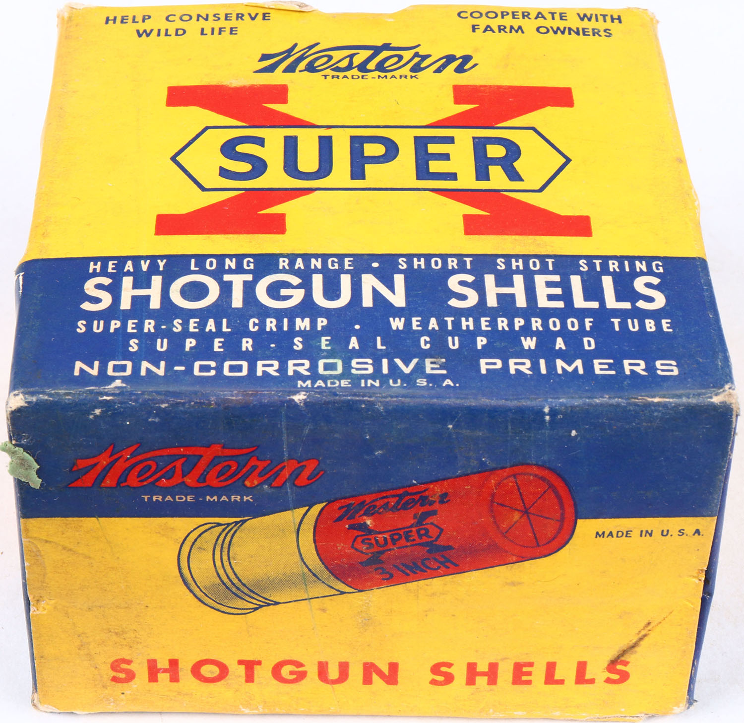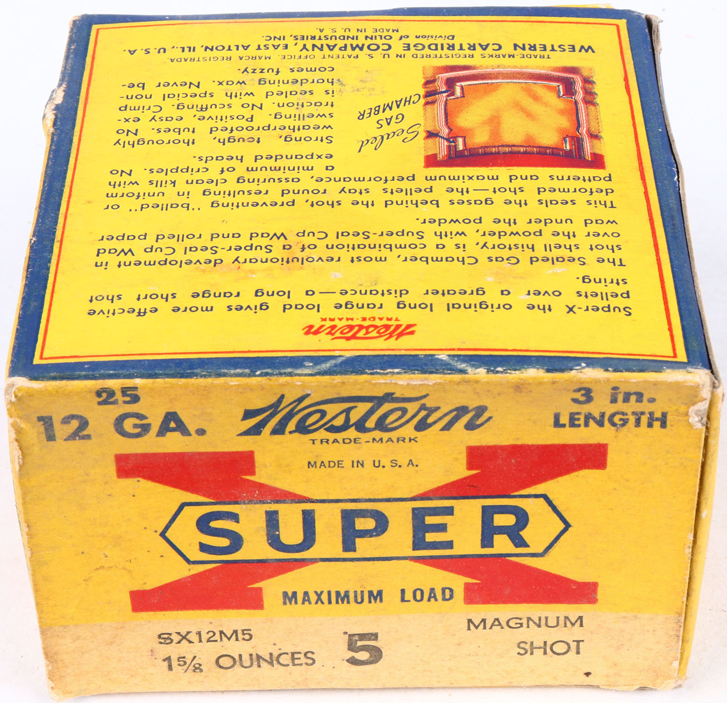 Western, Super X, 12ga., 3'', 1pc., Full, shot size 5 Magnum, yellow, blue & red box, box is solid with light soiling, shells are excellent. Grade: Excellent + - Value: 10 to 30