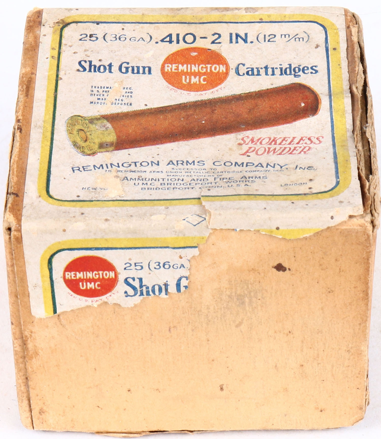 Remington UMC, SHOT GUN CARTRIDGES, 410ga., 2pc., Partial 1rd, shot size ?, 2'', Buff box with yellow, white & red paper label, label is 72% intact, box has incorrect bottom, seam split with age soiling and nice colors, shell is very good. Grade: Very Good + - Value: 30 to 200