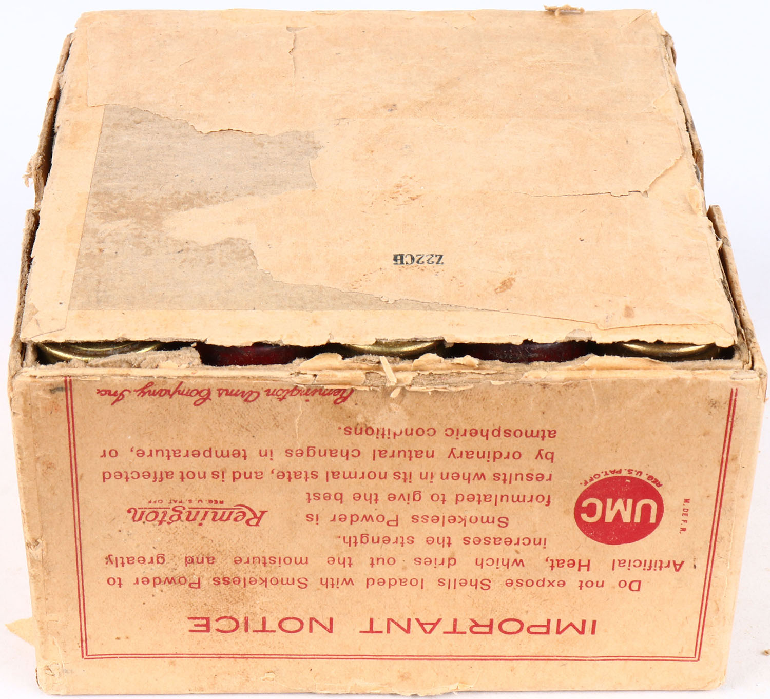 Remington UMC, Arrow, 8ga., 2pc., Full, 3'', buff box with buff, red label, bottom of box is completely disconnected, box has light soiling, seam split, with very good colors. Shells are very good. Grade: Excellent - Value: 50 to 500