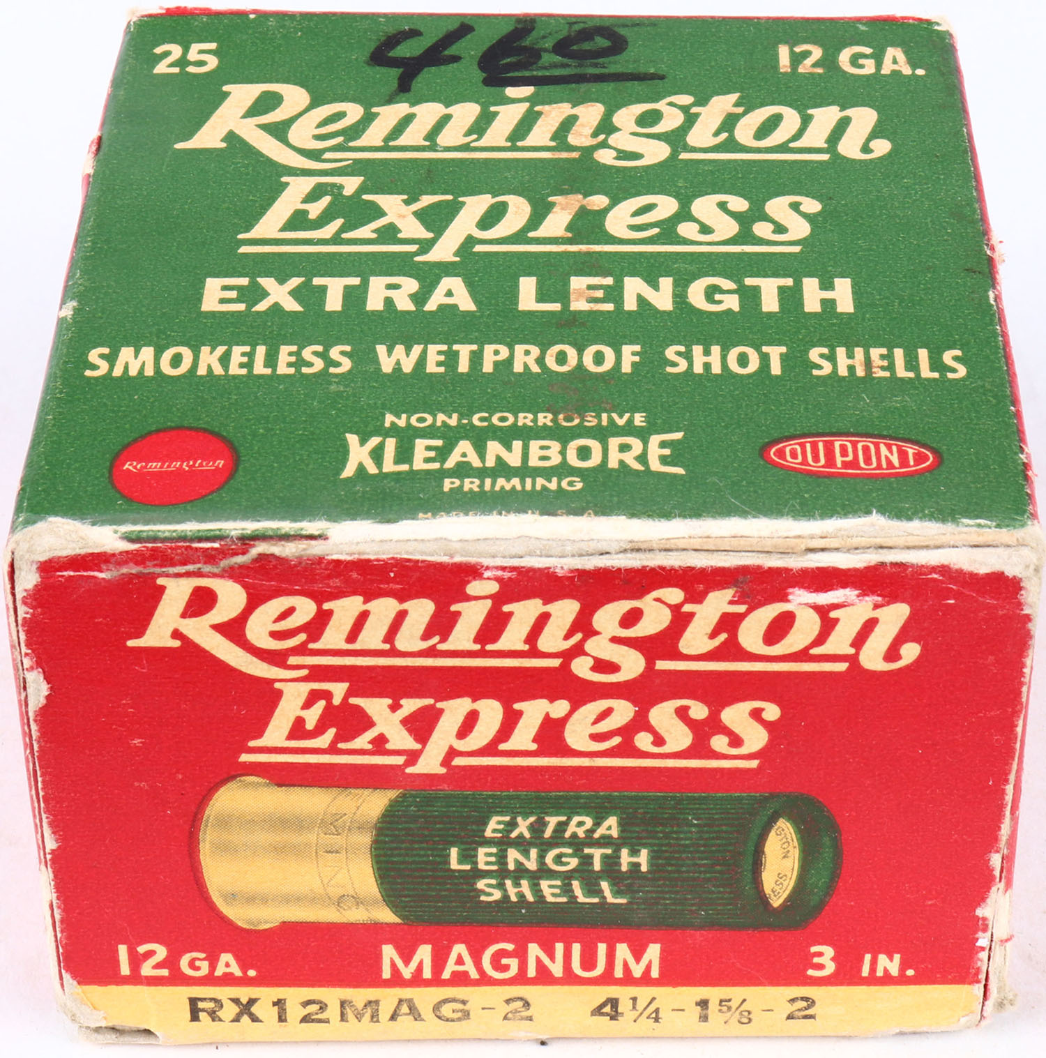 Remington, Kleanbore Express Magnum, 12ga., 1pc., Full, shot size 2 Magnum, red, white and green box, 3'', box is solid with edge wear, tape repair & has great colors, shells are excellent. Grade: Excellent - Value: 10 to 30
