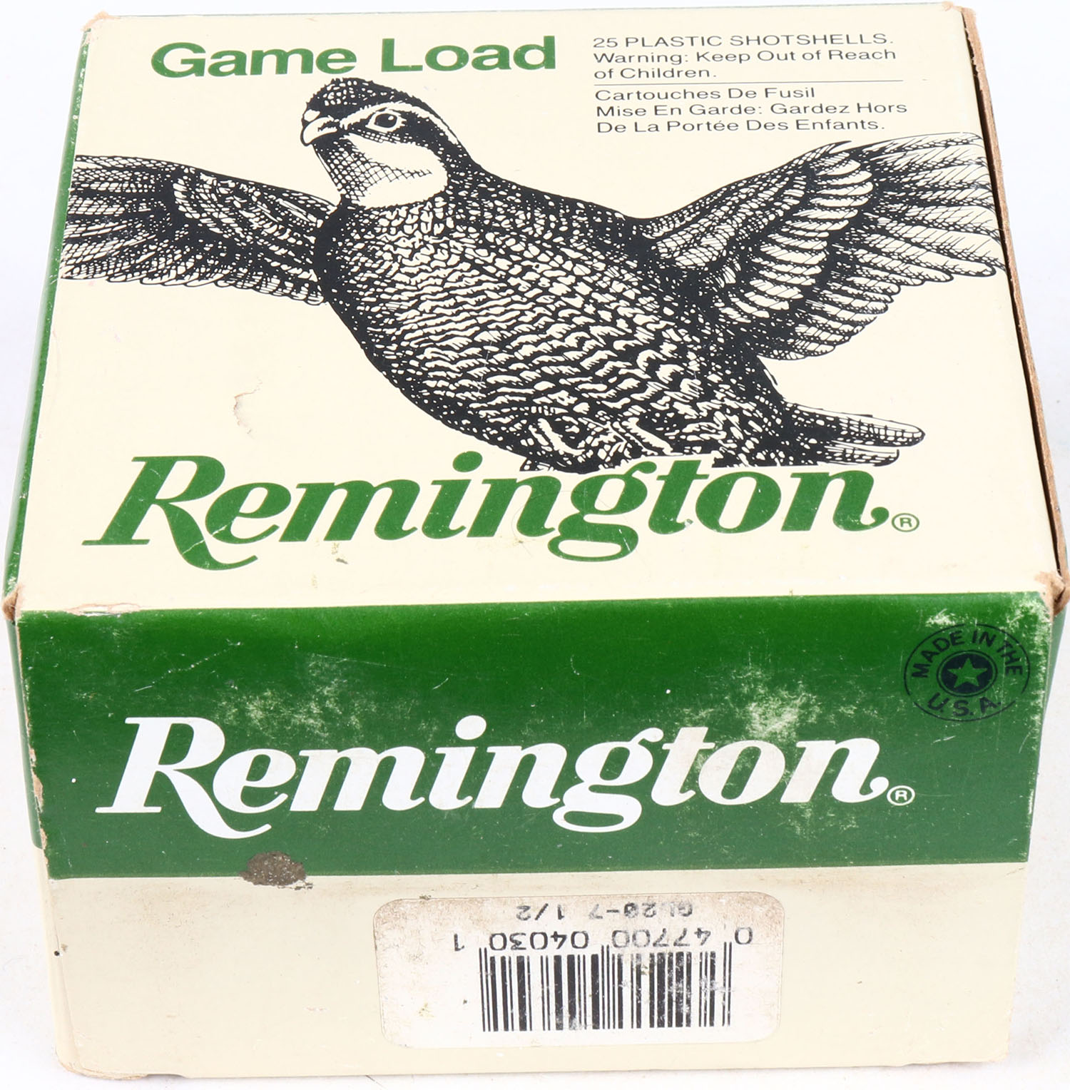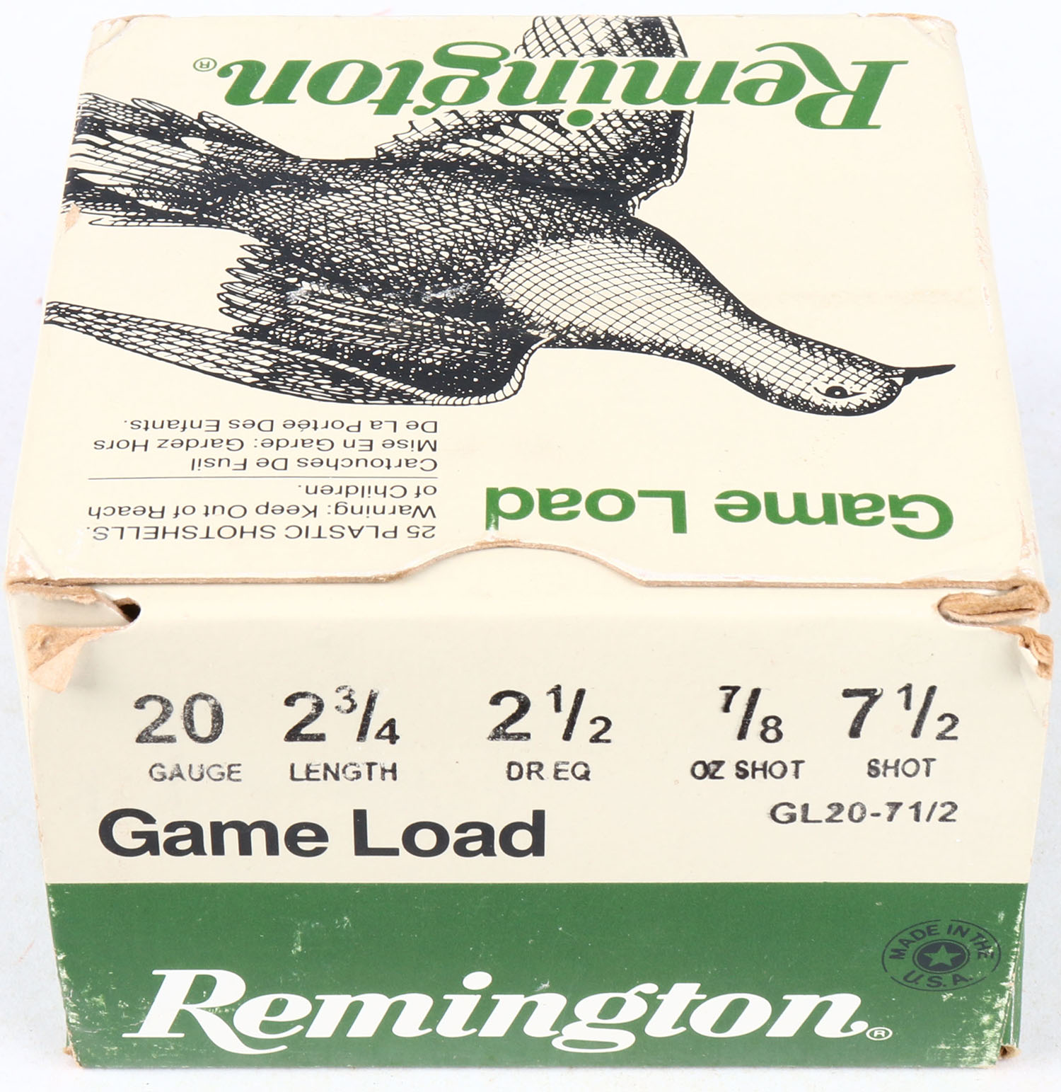 Remington, Game Load, 20ga., 1pc., Full, shot size 7 1/2, multi-colored box, shells are excellent. Grade: Excellent - Value: 10 to 20