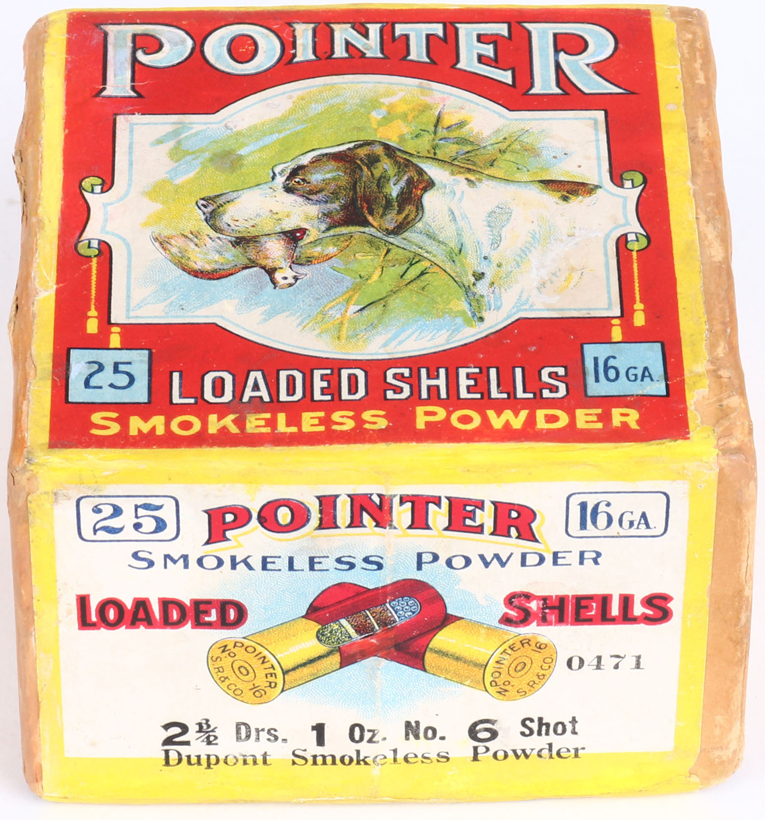 Sears. Roebuck & Co., POINTER, 16ga., 2pc., FULL & Professionally RESEALED, shot size 6, buff box with multi-colored label of a dog holding a quail, box is solid with light soiling, two shell protrusions has very nice label which has been professionally touched up, sides picture crossed shells & a dog on point, label is 100% intact. Grade: Excellent - Value: 300 to 1200