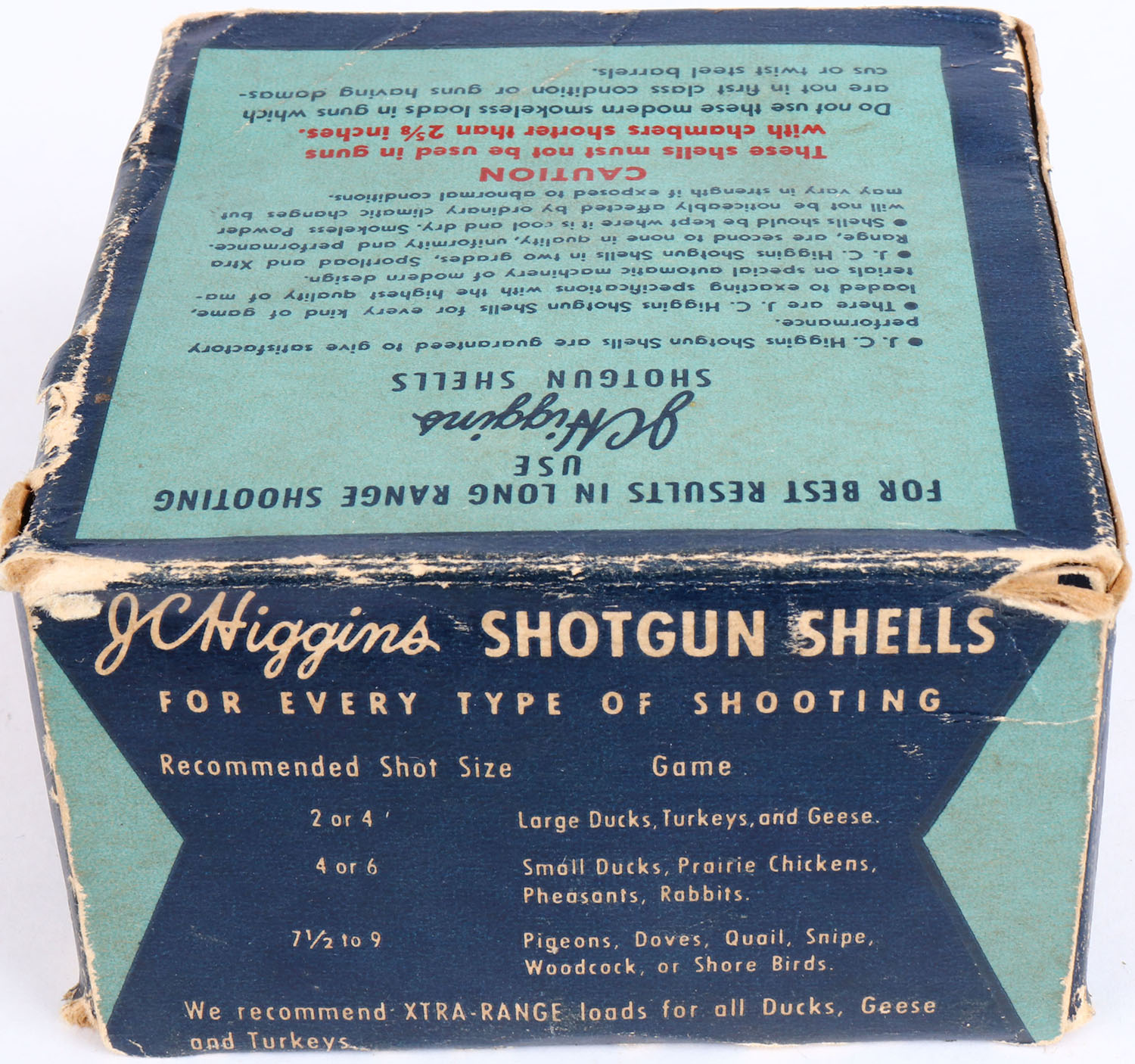 Sears, J.C. Higgins, Sportload, 12ga., 1pc., Full, shot size 4, multi-colored box, box has seam split, edge wear & writing on front of box with very good color, Shells are excellent. Grade: Very Good ++ - Value: 10 to 40