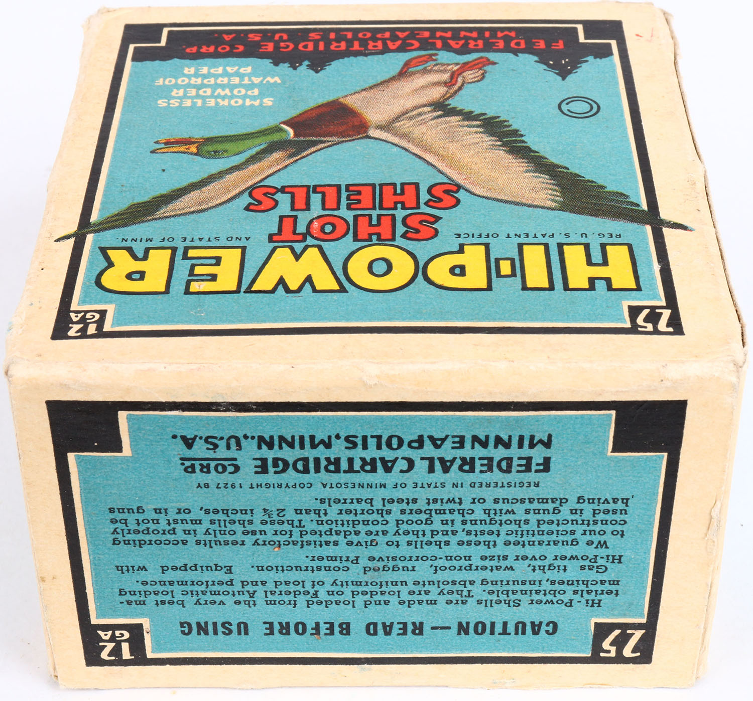 Federal Cart. Co., HI-POWER, 12ga., 1pc., Full, shot size 6, Black border, blue, yellow and red box with flying mallard, box is solid with great color, shells are excellent. Grade: Excellent + - Value: 10 to 40