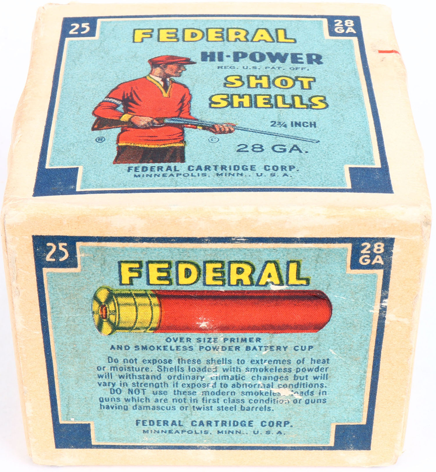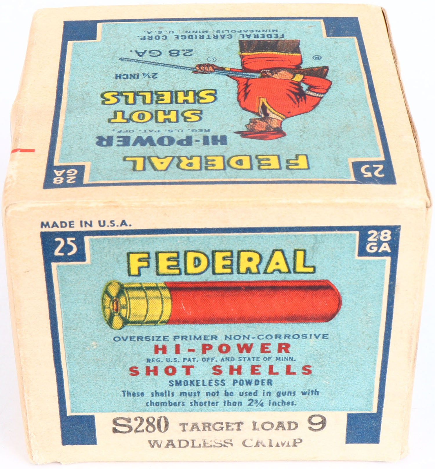 Federal Cart. Co., HI-POWER Target Load, 28ga., 1pc., Full, shot size 9, Blue border, blue, yellow and red box with Trap Shooter, box is solid with great color, shells are excellent. Grade: Excellent + - Value: 20 to 50