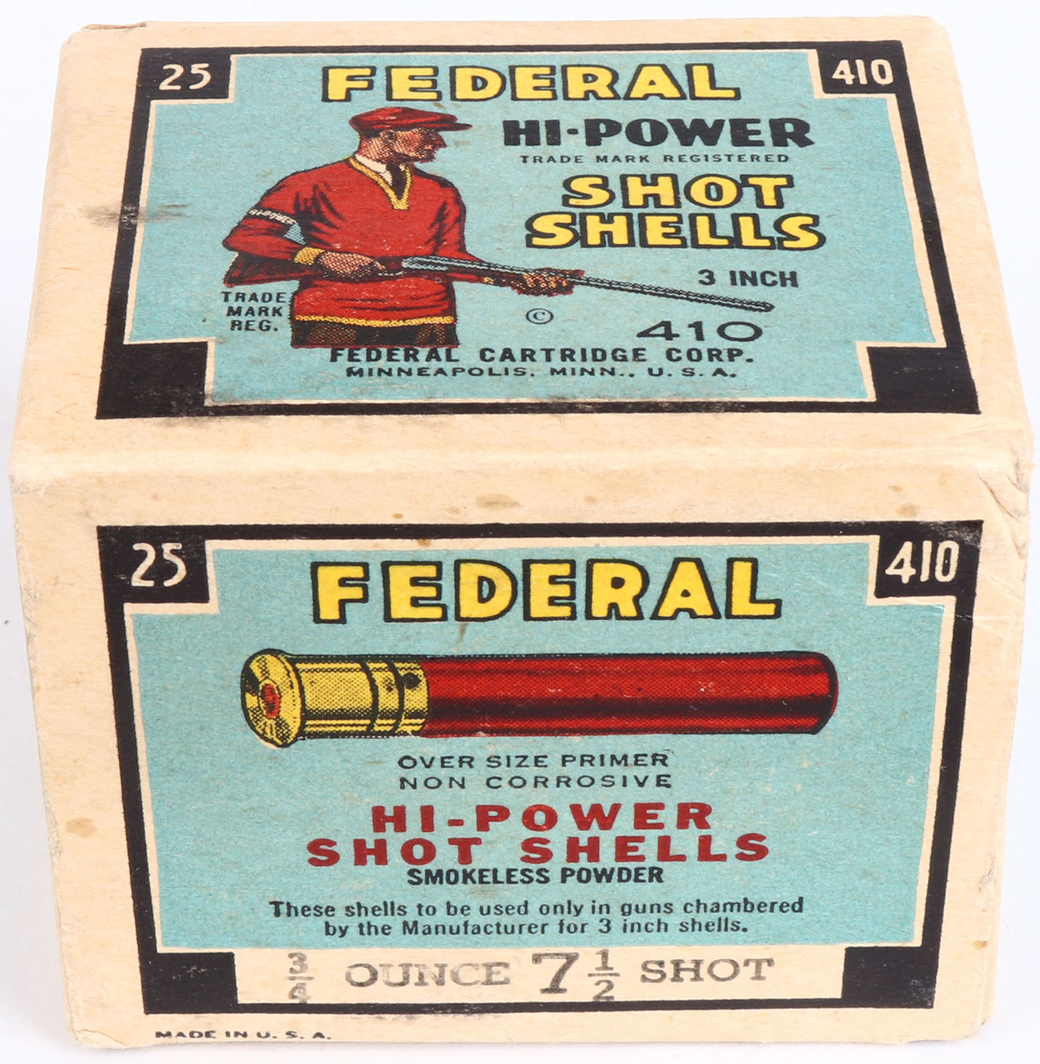 Federal Cart. Co., HI-POWER, 410ga., 1pc., Full, shot size 7 1/2, Black border, blue, yellow and red box with Trap Shooter, box is very solid has great color, shells are excellent. Grade: Excellent + - Value: 20 to 50