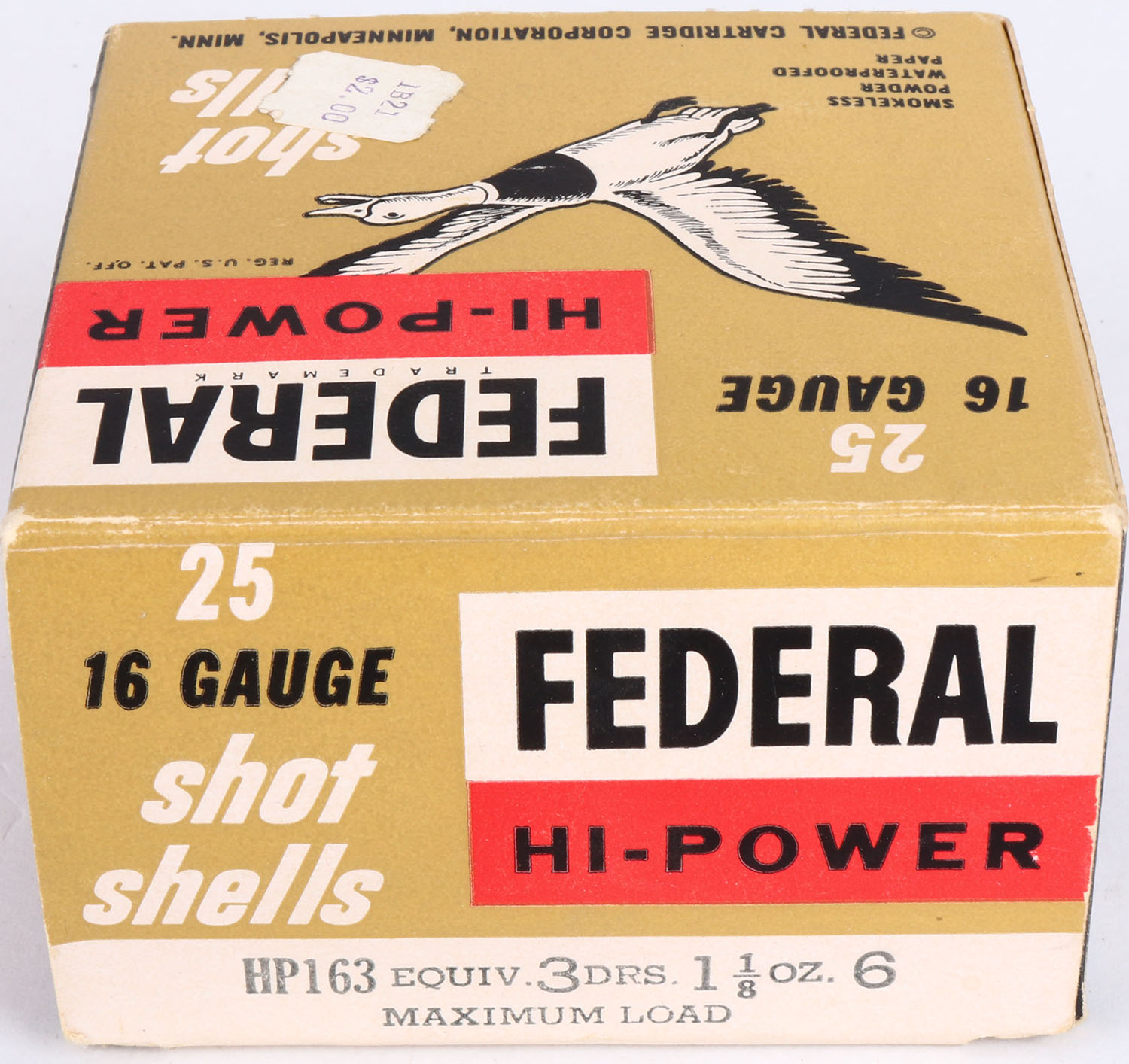 Federal, Hi-Power, 16ga., 1pc., Full, shot size 6, multi-colored box, shells are excellent. Grade: Excellent - Value: 10 to 20