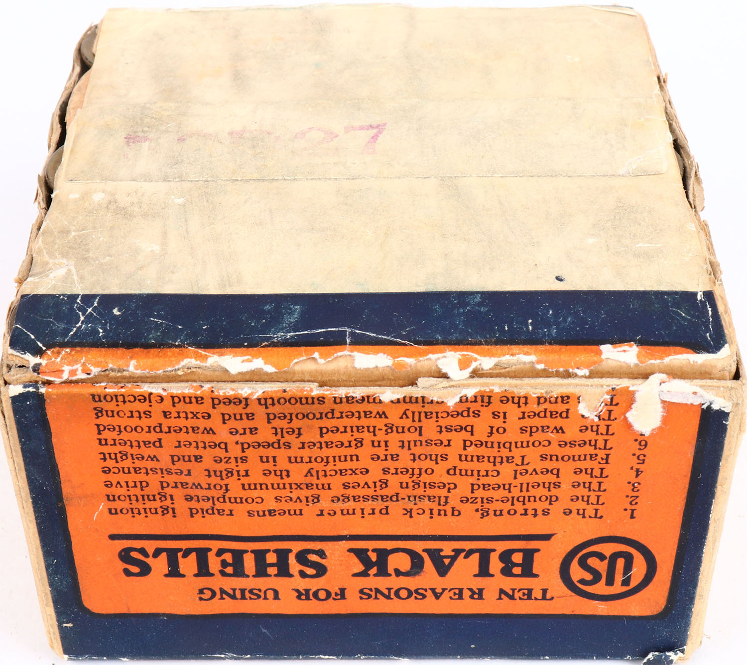US Cart. Co., Lowell, Mass, Climax, 12ga, 2pc., Partial 23rds, shot size 4B, buff box orange, blue & white label, box has seam splits & soiling with very nice colors, Shells are very good. Grade: Very Good ++ - Value: 10 to 80