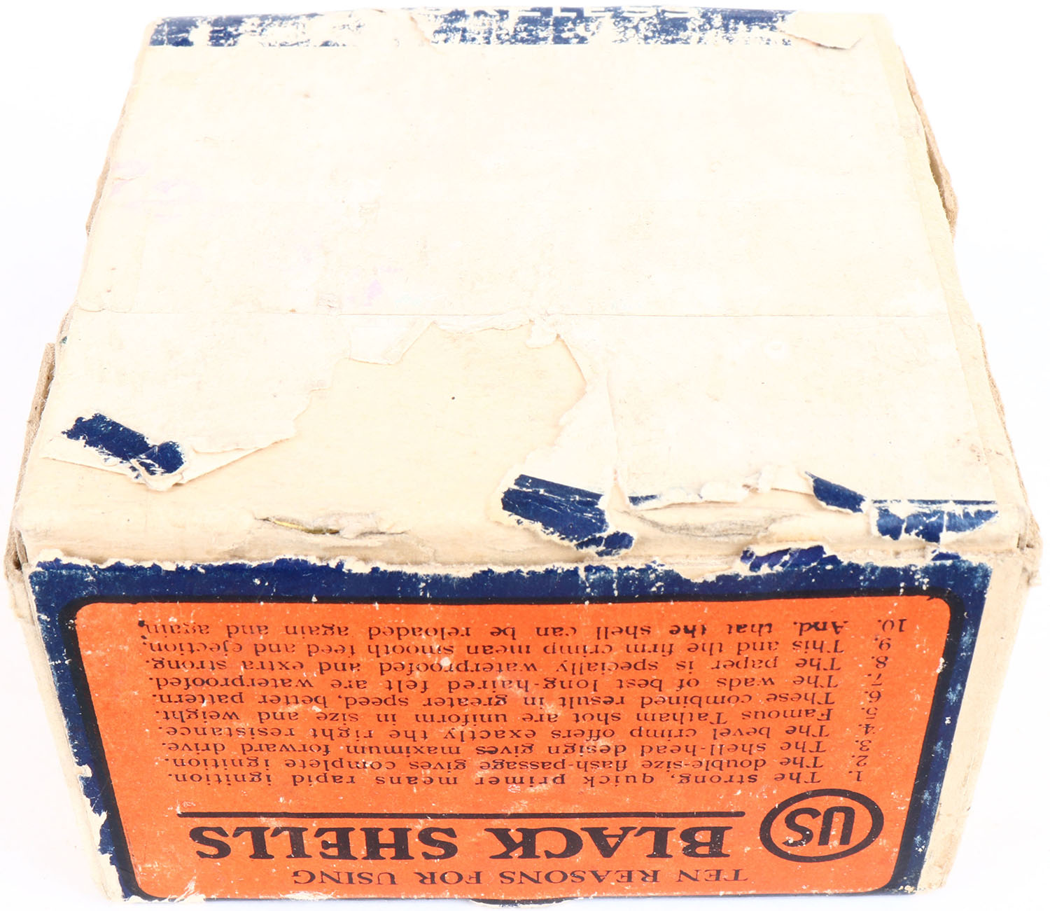 US Cart. Co., Lowell, Mass, Climax, 12ga, 2pc., Full, shot size 7 1/2C, buff box orange, blue & white label, box has edge wear, shell protrusions & scuffing with very nice colors, Shells are excellent. Grade: Very Good ++ - Value: 20 to 80