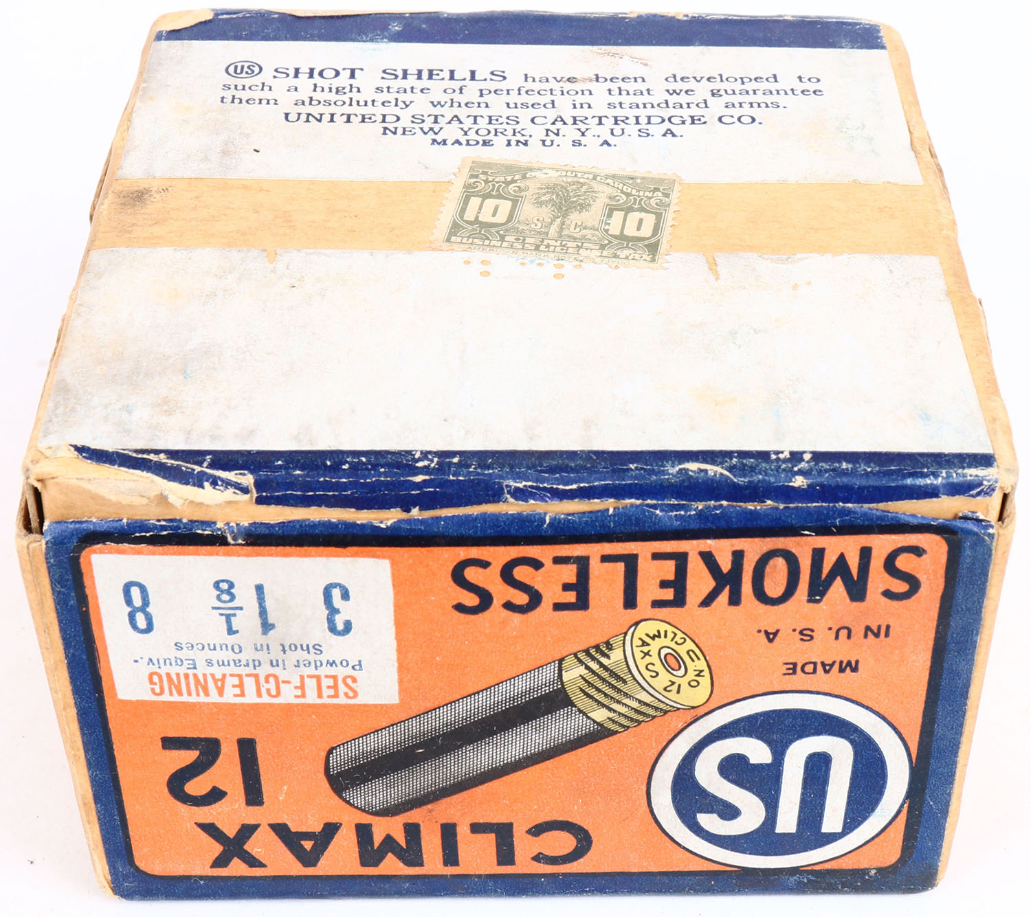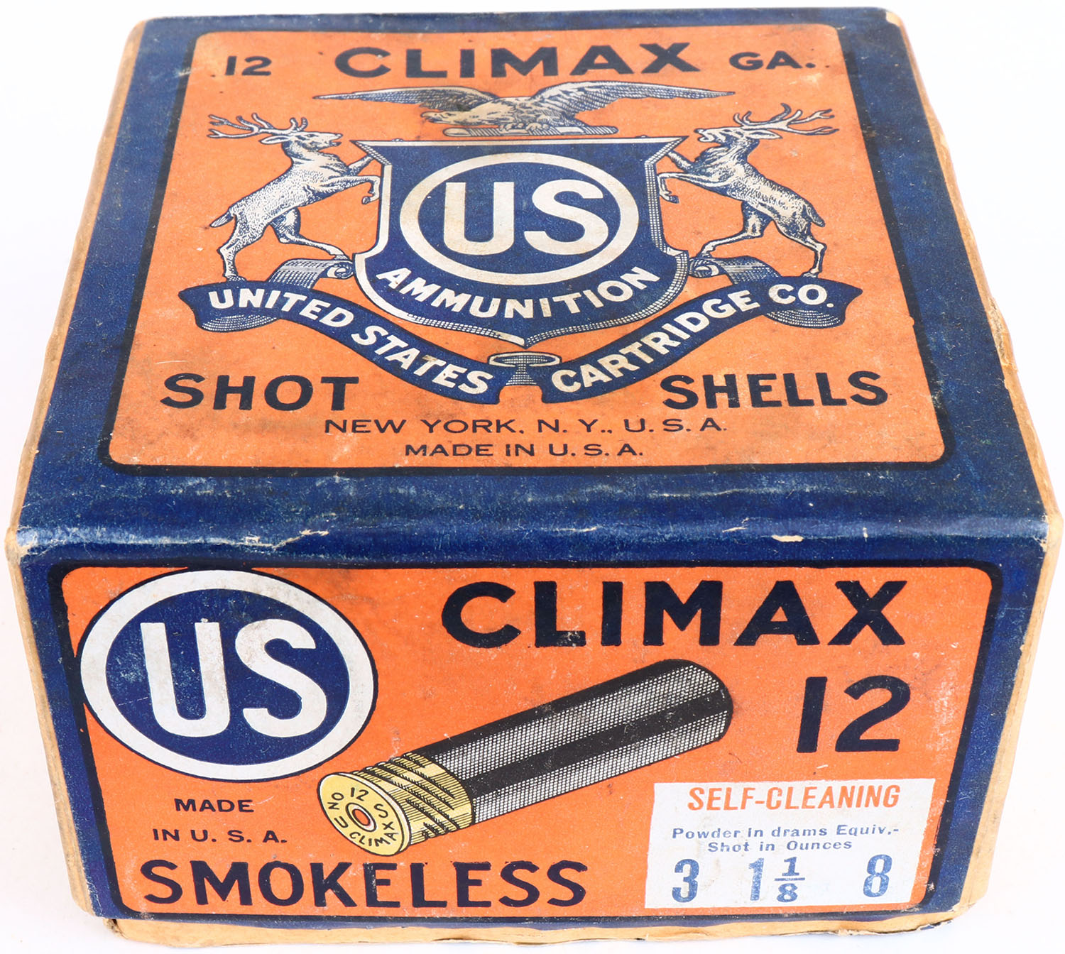 US Cart. Co., New York, N.Y, Climax, 12ga, 2pc., Full, shot size 8, buff box orange, blue & white label, box is very solid with light age soiling & great colors, Shells are very good but swollen. Grade: Excellent - Value: 30 to 100