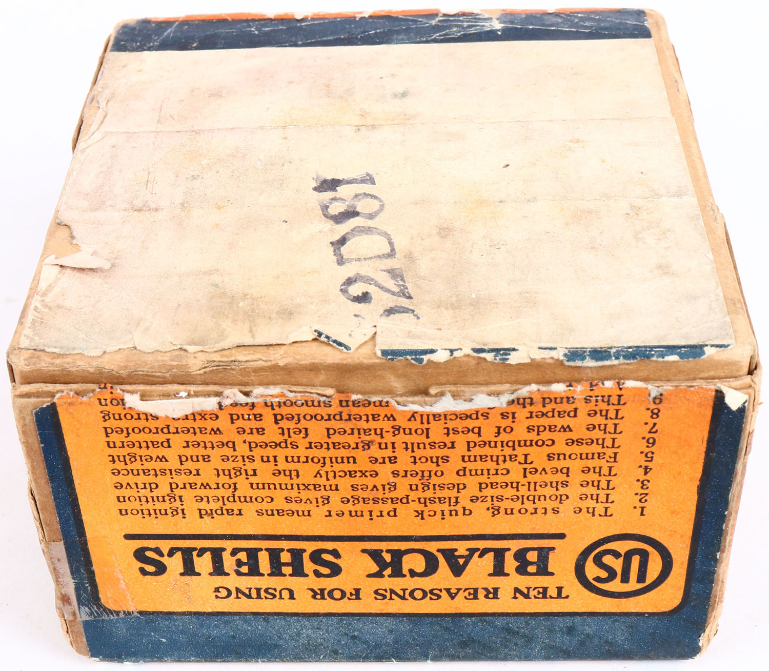 US Cart. Co., Lowell, Mass, Climax, 12ga, 2pc., Empty, shot size 8, buff box orange, blue & white label, box has taped seam splits, age soiling, edge wear, torn left side of box with nice colors. Grade: Very Good + - Value: 10 to 60
