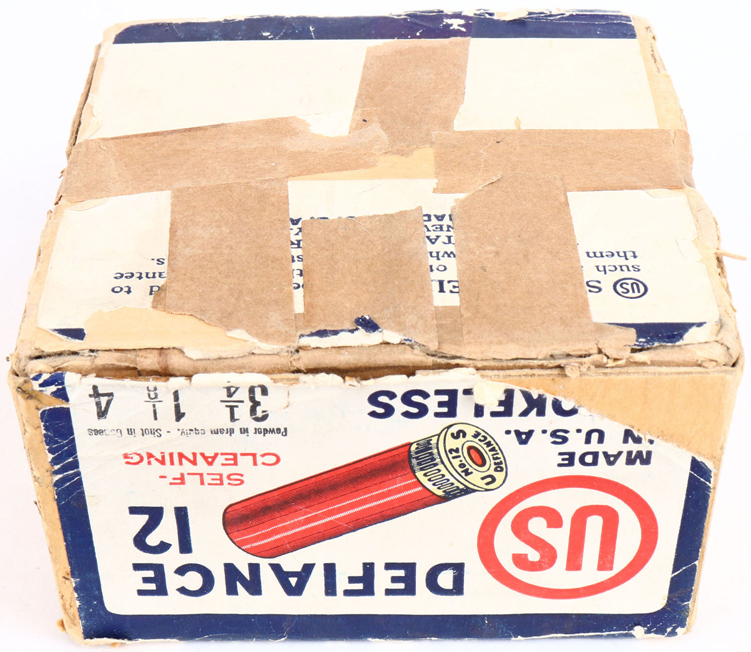 United States Cart. Co., New York, NY, DEFIANCE, 12ga., 2pc., Partial 19rds, shot size 4, buff box with white, red & blue label, box has seam splits, shell protrusion, scuffing & light soiling with very nice label, shells are excellent. Grade: Excellent - Value: 20 to 120