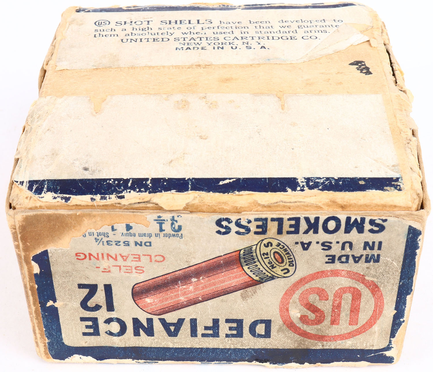 United States Cart. Co., New York, NY, DEFIANCE, 12ga., 2pc., Partial 5rds, shot size 5, buff box with white, red & blue label, box has seam splits, edge wear & age soiling with nice label, shells are excellent. Grade: Very Good ++ - Value: 20 to 100