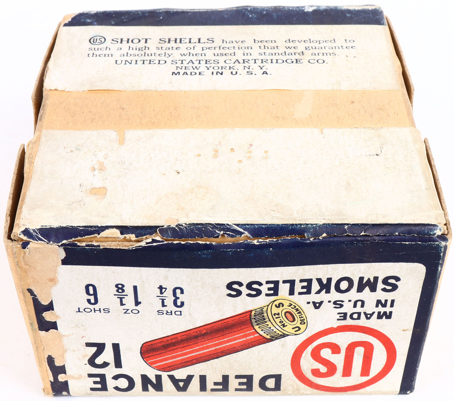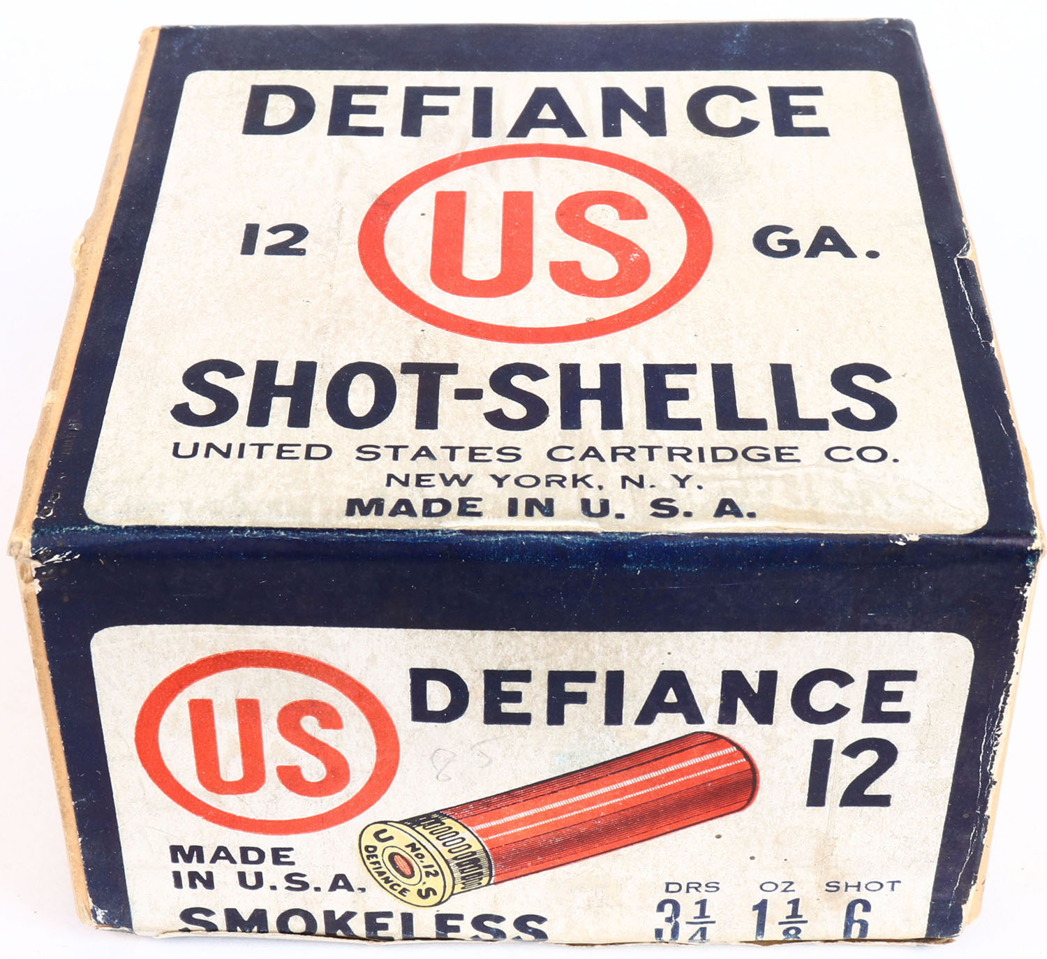 United States Cart. Co., New York, NY, DEFIANCE, 12ga., 2pc., Partial 1rd., shot size 6, buff box with white, red & blue label, box has light soiling with very nice label, shell is excellent. Grade: Excellent + - Value: 40 to 100