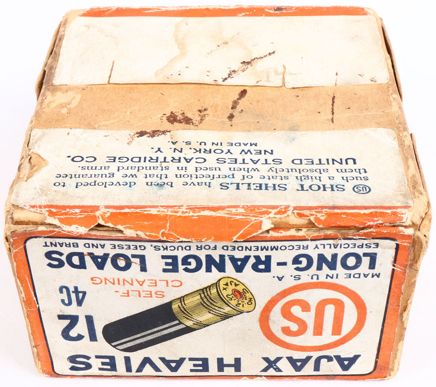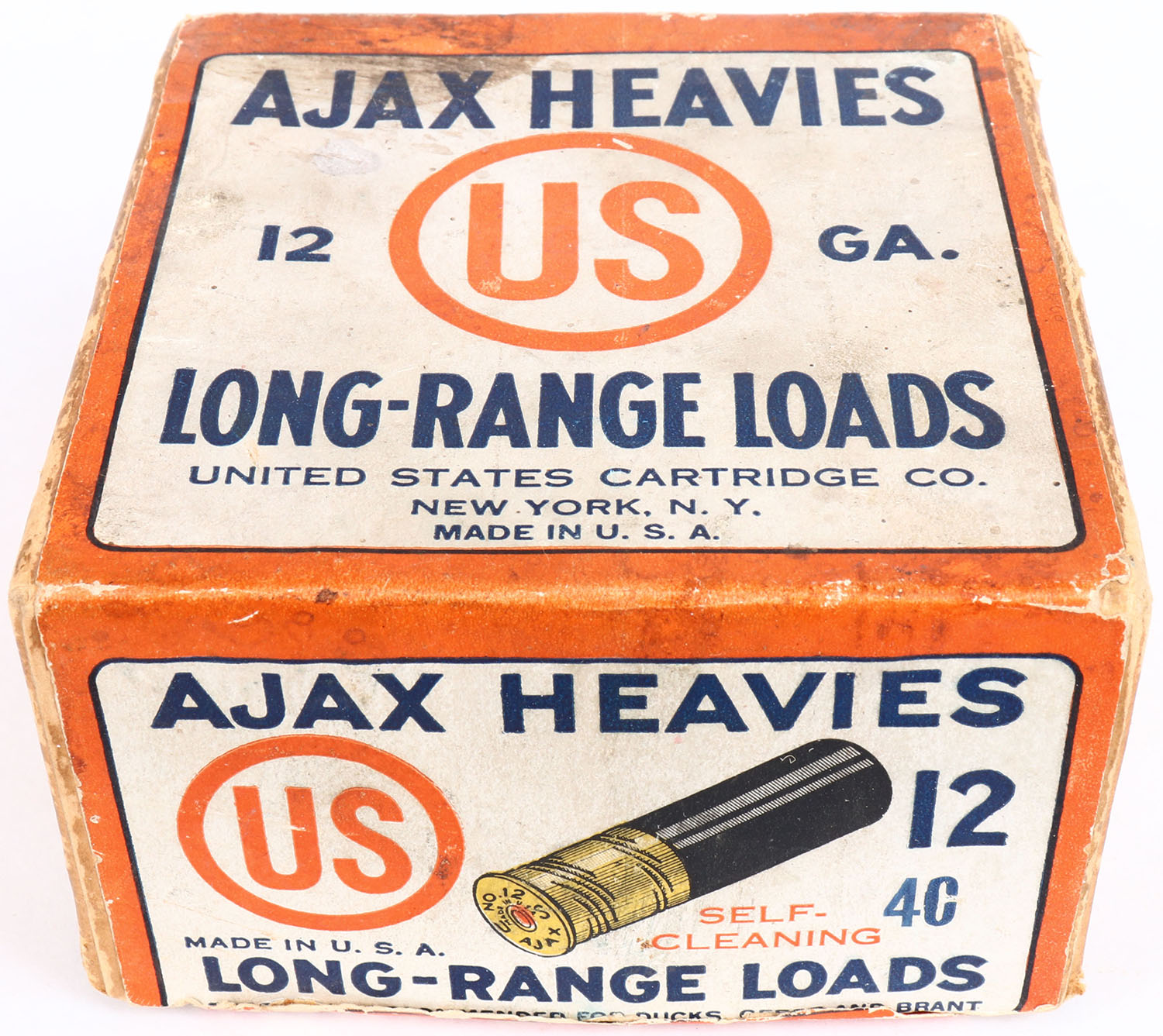U.S. Cart. Co., New York, NY, AJAX HEAVIES, 12ga., 2pc., Empty, shot size 4C, buff box with white, orange & blue paper label, box has edge wear & age soiling box is torn on left side. Grade: Very Good ++ - Value: 10 to 50