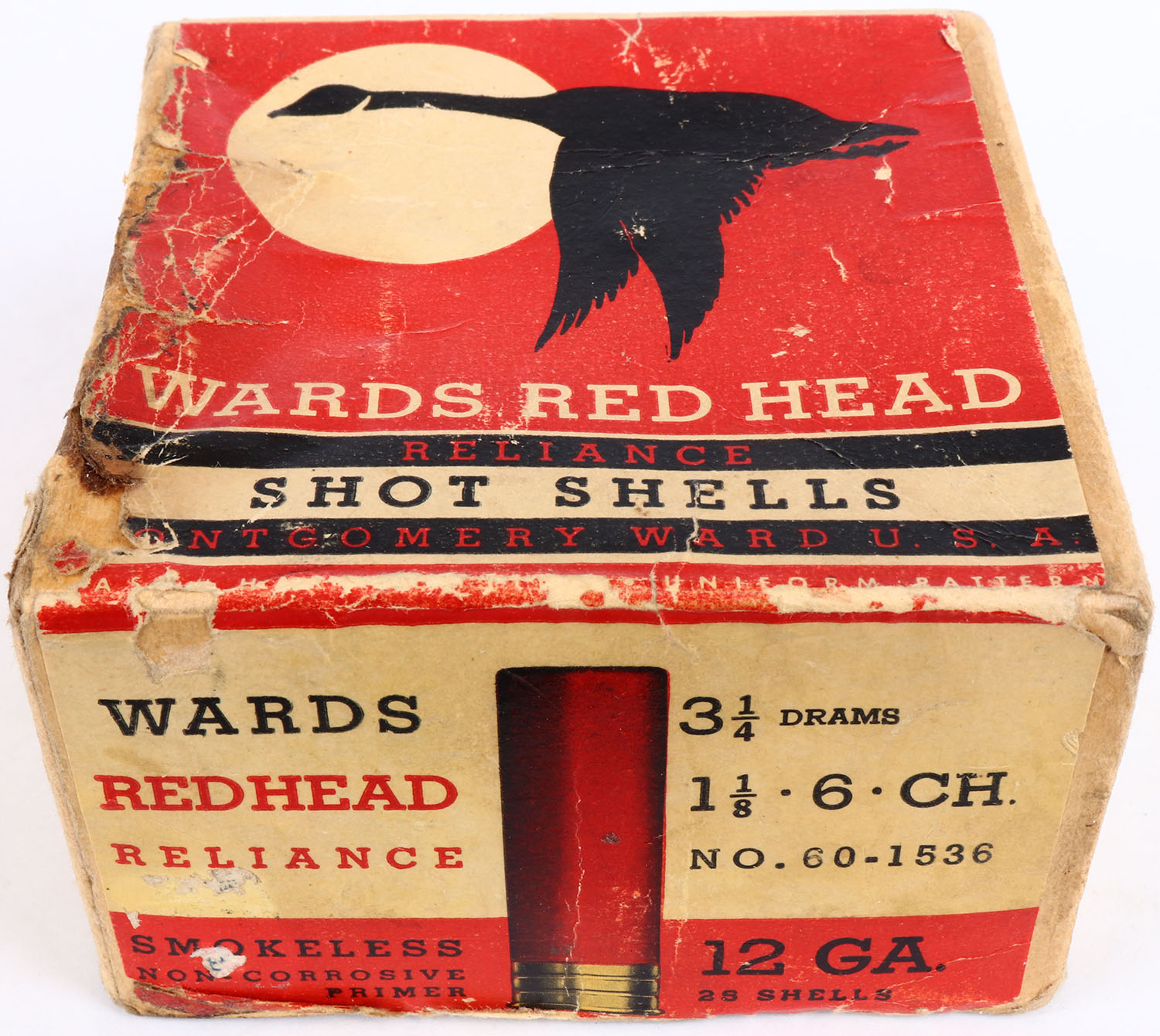 Montgomery Ward & Co., Red Head, 12ga., 2pc., Empty, shot size 6CH, red background with black goose flying through the moon, box is solid with great colors, light edge wear, light soiling. Grade: Very Good ++ - Value: 10 to 80