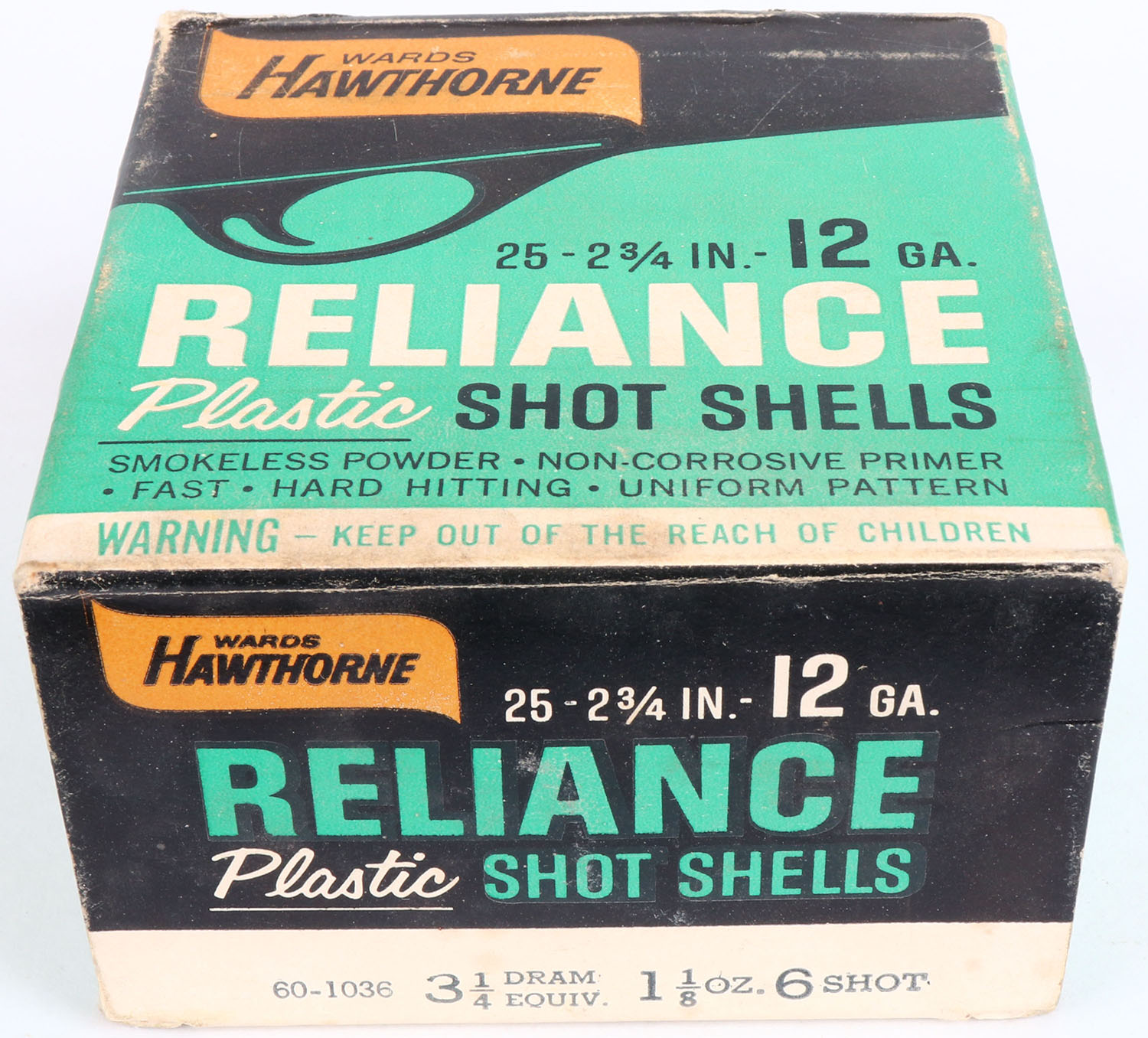Montgomery Ward Hawthorne, 12ga., 1pc., Full, shot size 6, box is solid with very nice colors, shells are excellent. Grade: Excellent + - Value: 10 to 30