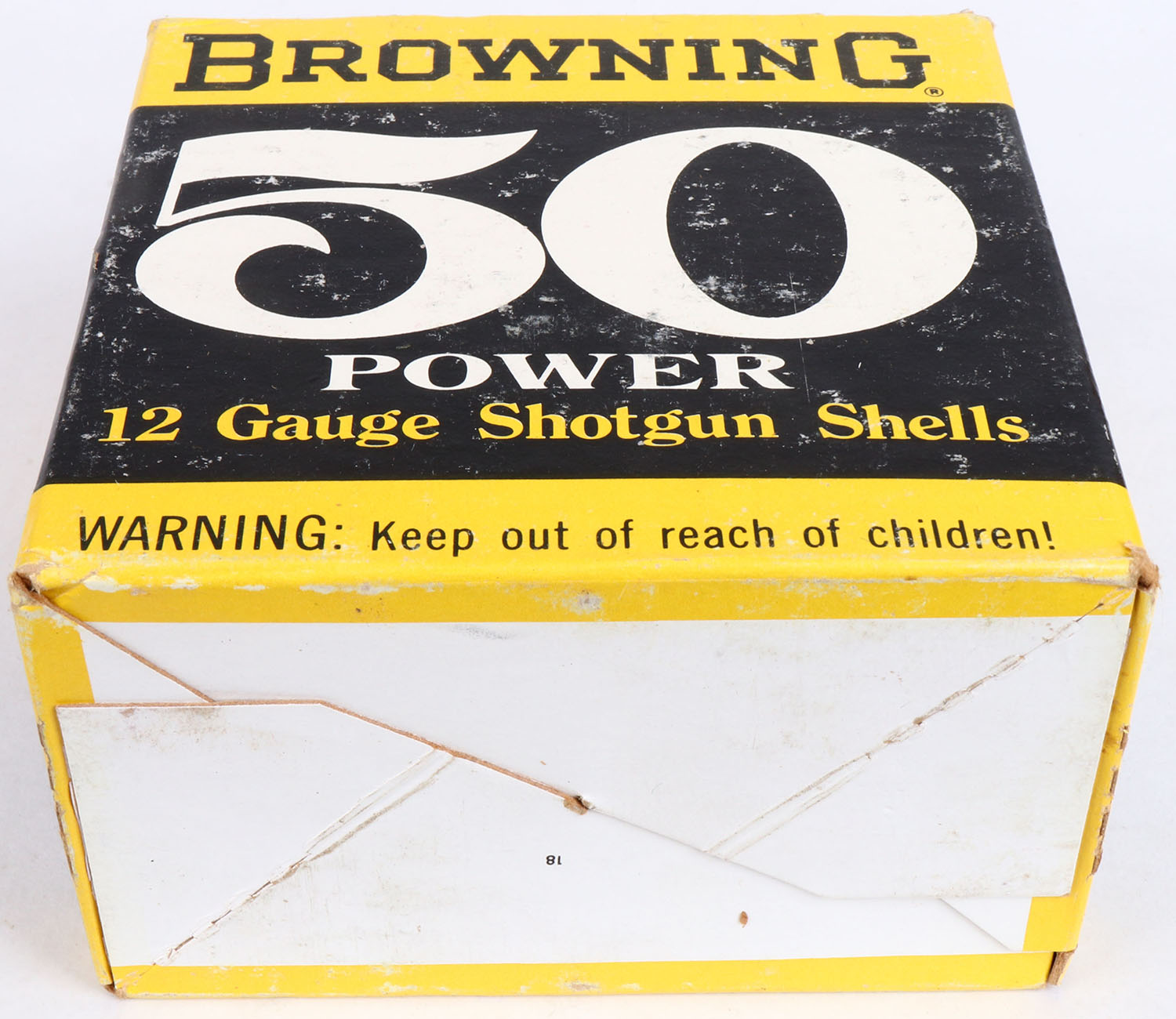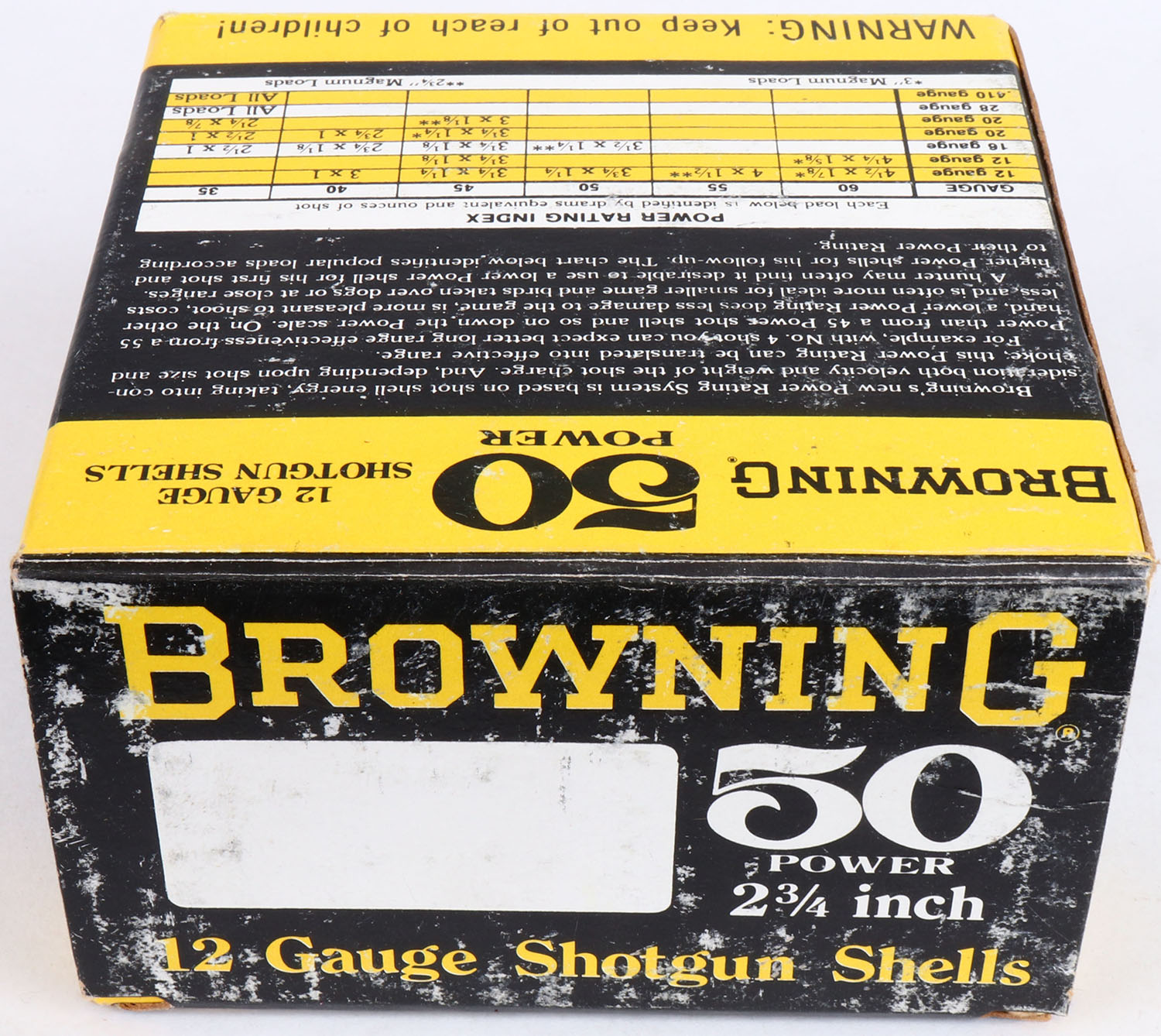 Browning, 50 Power with Acrylic box, 12ga., 1pc., FULL, shot size doesn't say but shells are 6, 2 3/4'', black, yellow & white box, box is solid with nice color, shells are excellent. Grade: Excellent - Value: 20 to 60