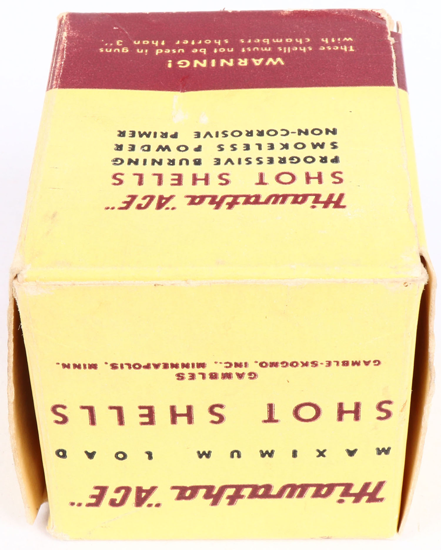 Gambles, Hiawatha Paper Shells, .410ga., 1pc., Partial 13rds., shot size 4, yellow, maroon & white box, box is solid with great color, shells are excellent. Grade: Excellent - Value: 6 to 20