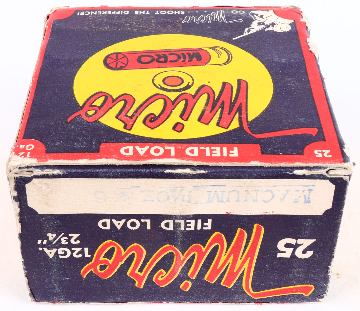 Micro, Field Load, 12ga., 1pc., Partial 15rds, shot size 6 Magnum multi-colored box, box is very solid with edge wear, shells are excellent. Grade: Excellent + - Value: 8 to 20