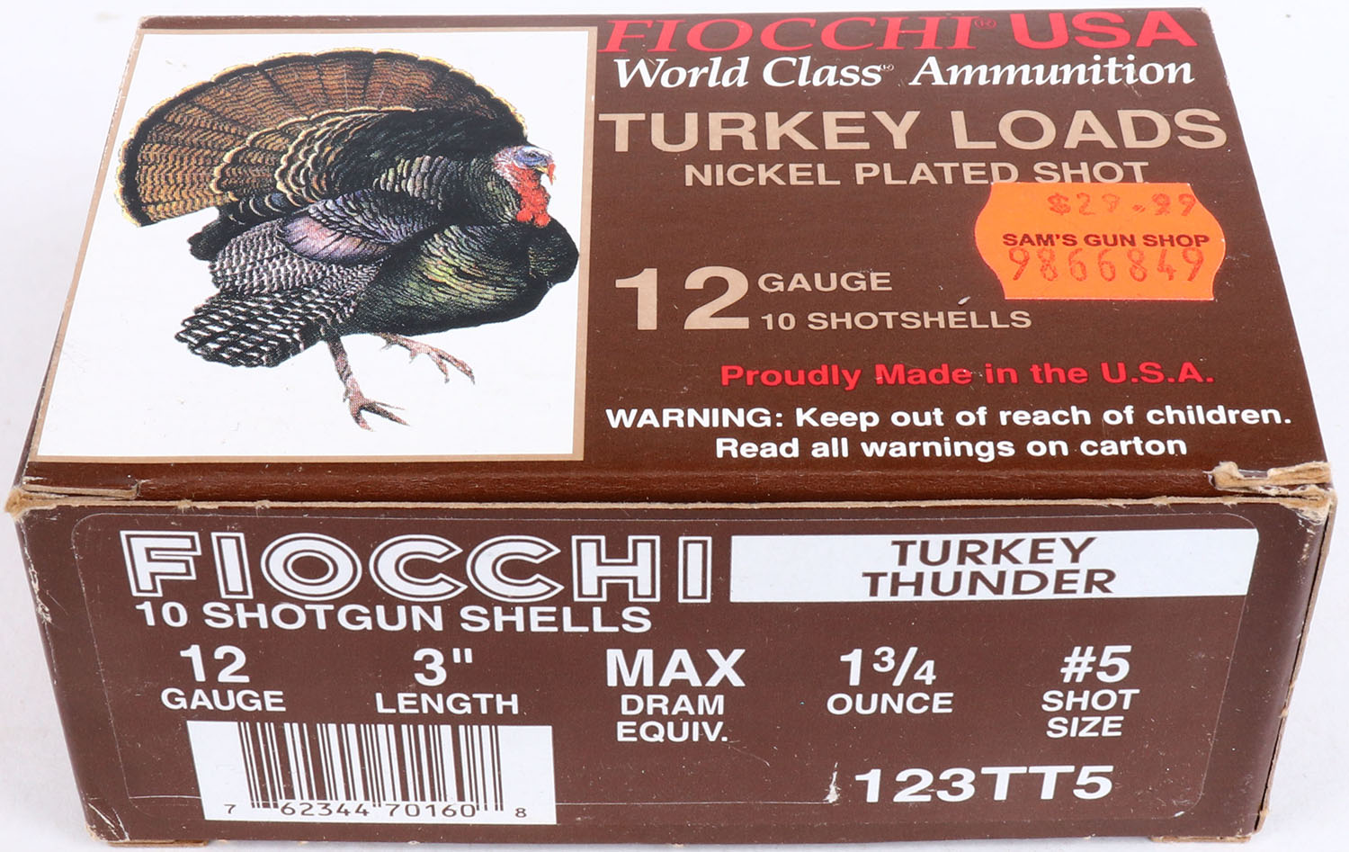 Fiocchi, 12ga., 1pc., Full, shot size 5 Turkey Loads, multi-colored box, box is very solid, shells are excellent. Grade: Excellent + - Value: 4 to 20