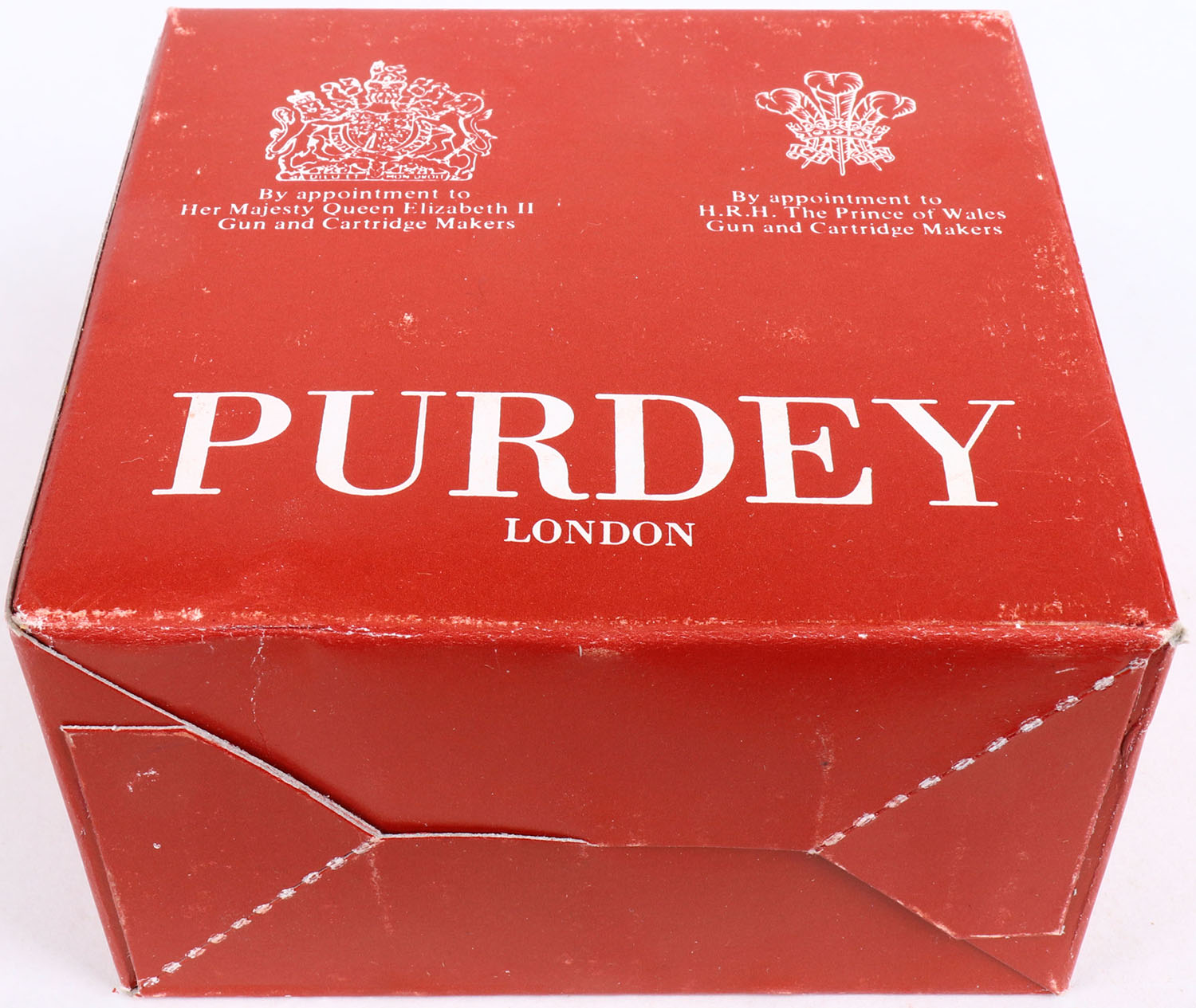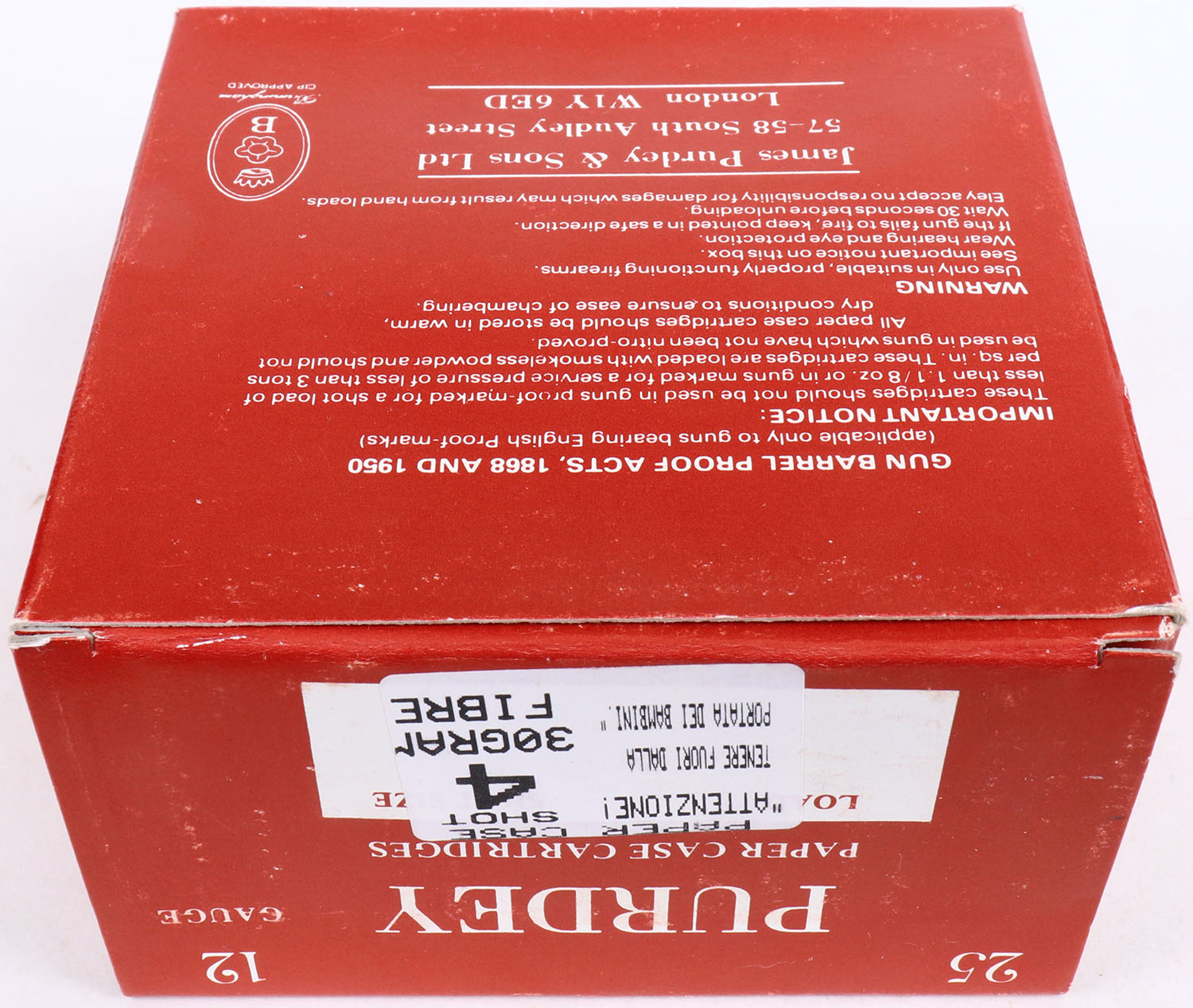 Purdey, 12ga., 1pc., Full, shot size 4, multi-colored box, box is solid, Shells are excellent. Grade: Excellent + - Value: 10 to 20