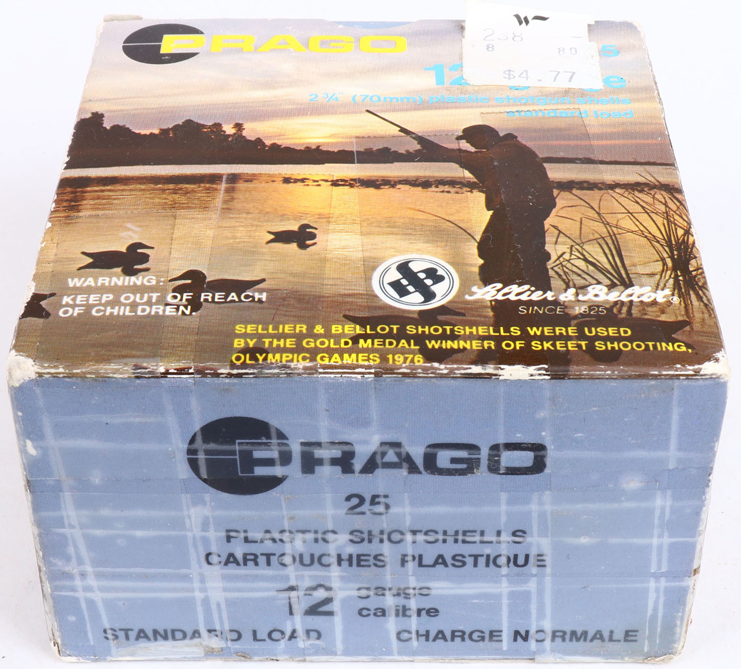 Prago, 12ga., 1pc., Full, shot size 7 1/2, multi-colored box, box is solid, Shells are excellent. Grade: Excellent + - Value: 10 to 20