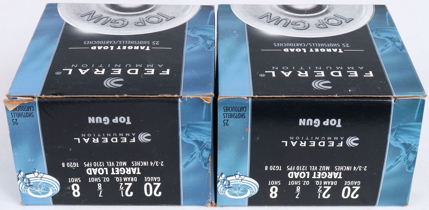 Lot of 2 Federal Target Load, 20ga., 1pc., Appears Full, 2 3/4'', shot size 8, multi-colored box, shells are excellent. Grade: Excellent + - Value: 10 to 20