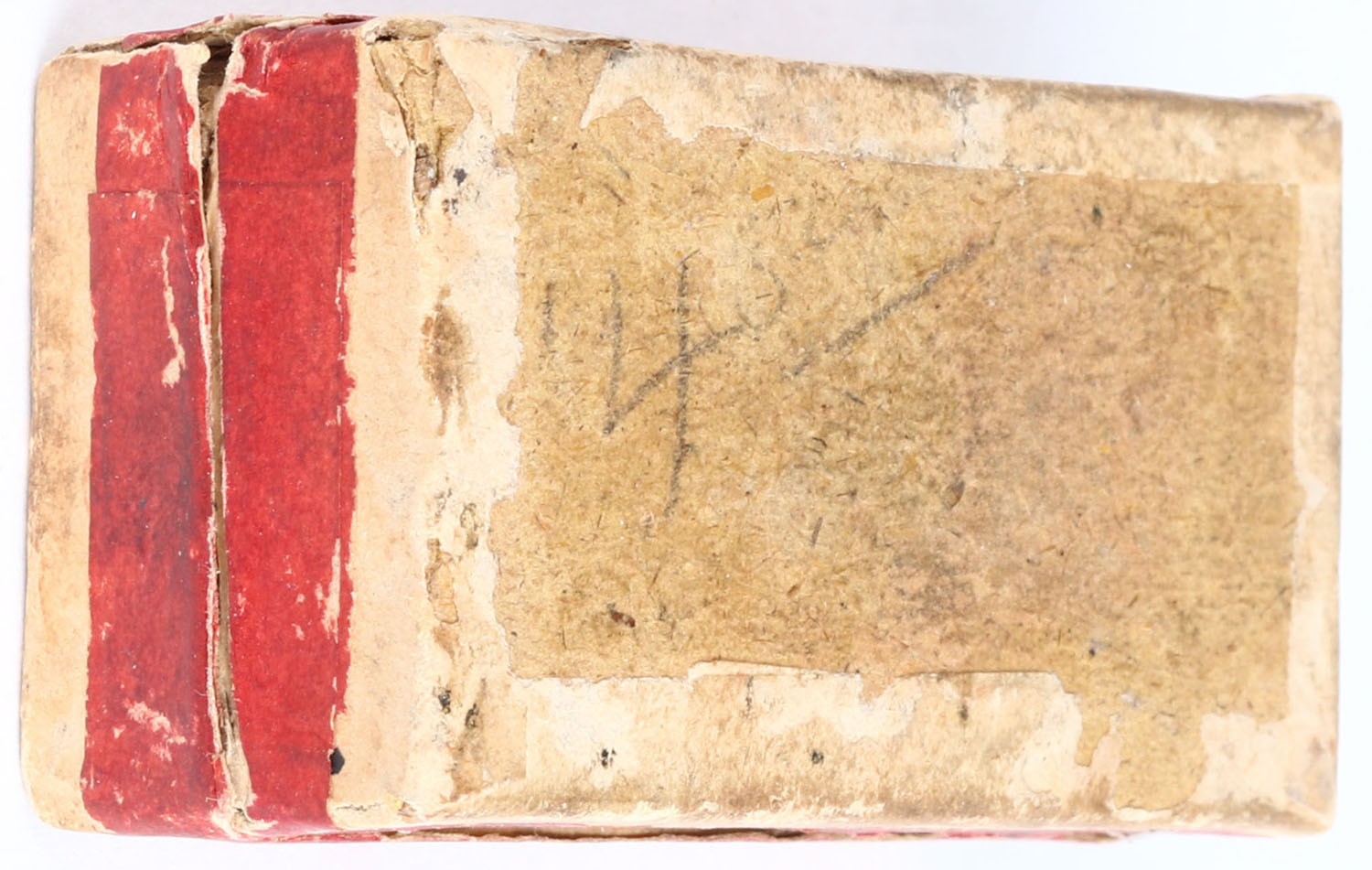 Winchester, .22 Long Target Cartridges, Oct. 24 Patent date, RR: WRA-45 L-6, Full, 2pc. Buff box with green top & red side sealing labels, box is solid with very good color, some age soiling, very minor edge & corner wear, vertical seam split to back right corner of lid, bottom has been written on, labels are 99% intact. Grade: Excellent - Value: 100 to 300