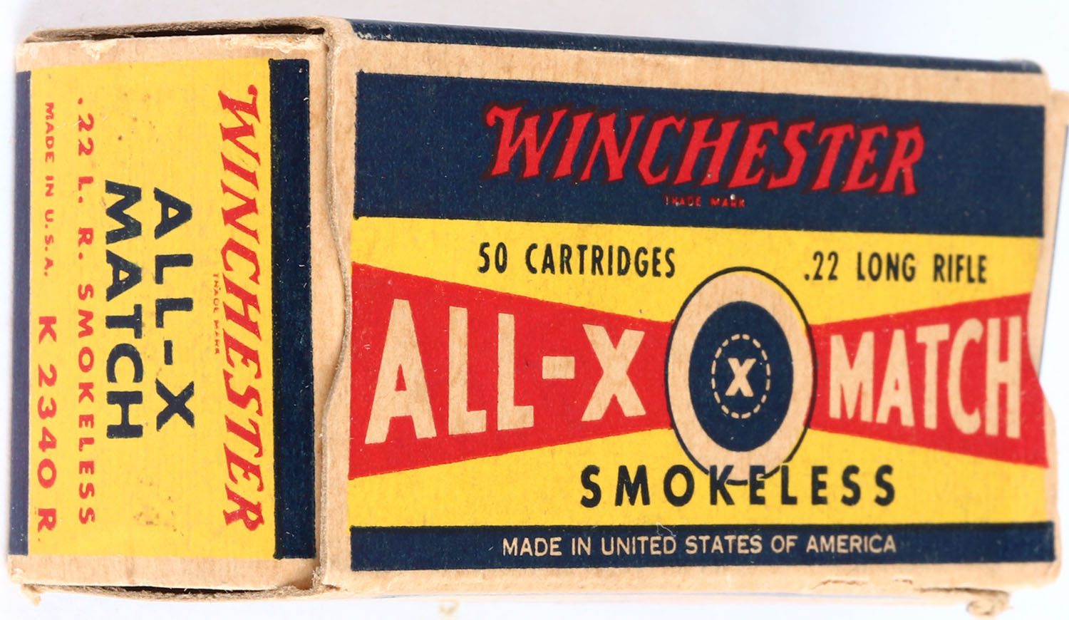 Winchester, All-X Match, .22 Long Rifle, Smokeless, RHWeb: WRA-54 LR-1, Full, 1pc. Yellow red & blue box, right end flap is torn, box has excellent color, some age soiling, partial seam split to top front edge, very minor corner wear, edges are mostly crisp, left end flap is solid, ammo is very good. Grade: Very Good + - Value: 30 to 120