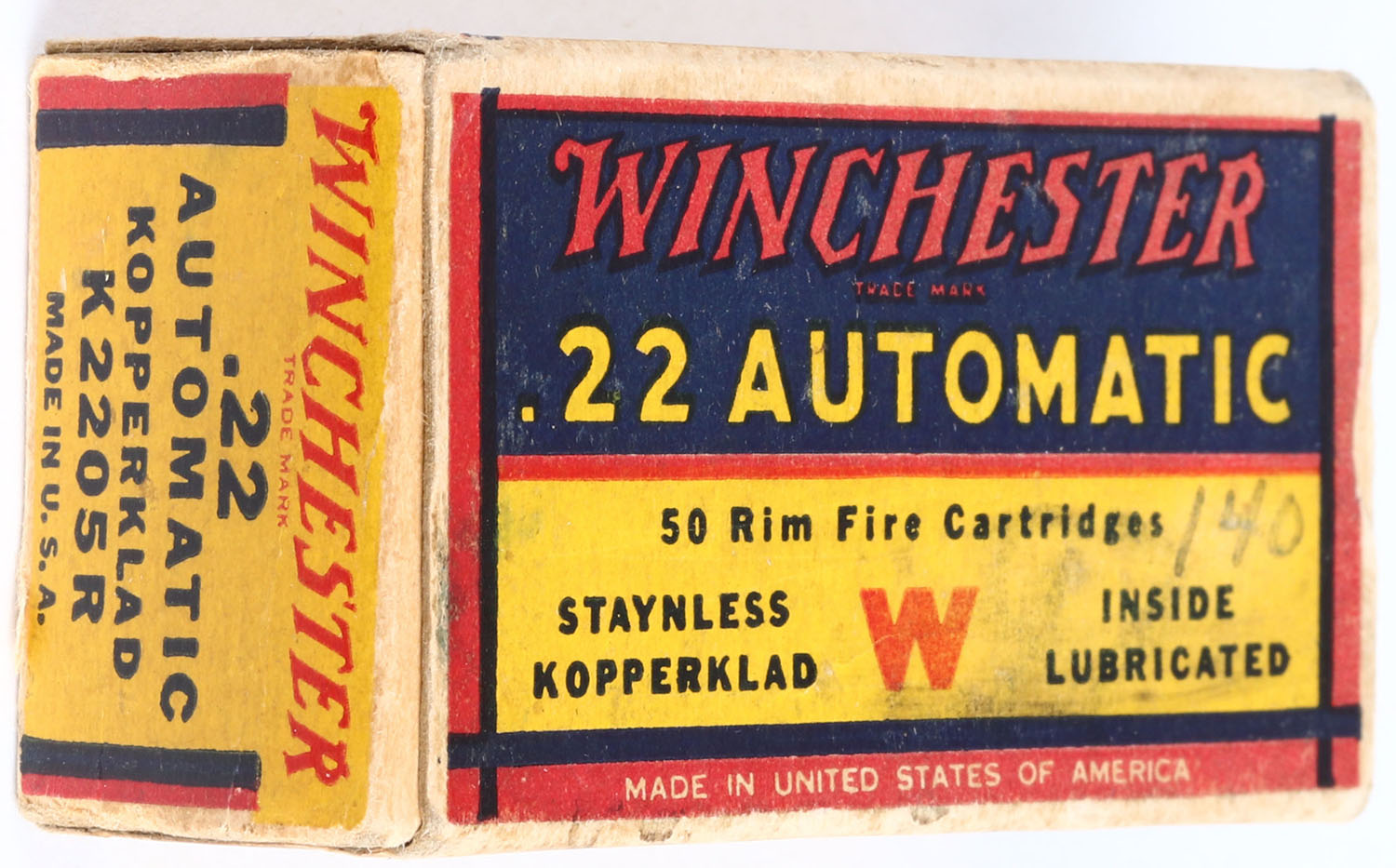 Winchester, .22 Automatic, Staynless Kopperklad, RHWeb: WRA-15 WA-1a, Full, 1pc. Yellow red & blue box, box is solid with very good to excellent color, some age soiling, minor corner wear, edges are mostly crisp, end flaps are solid, top has been written on, ammo is excellent. Grade: Very Good ++ - Value: 30 to 90