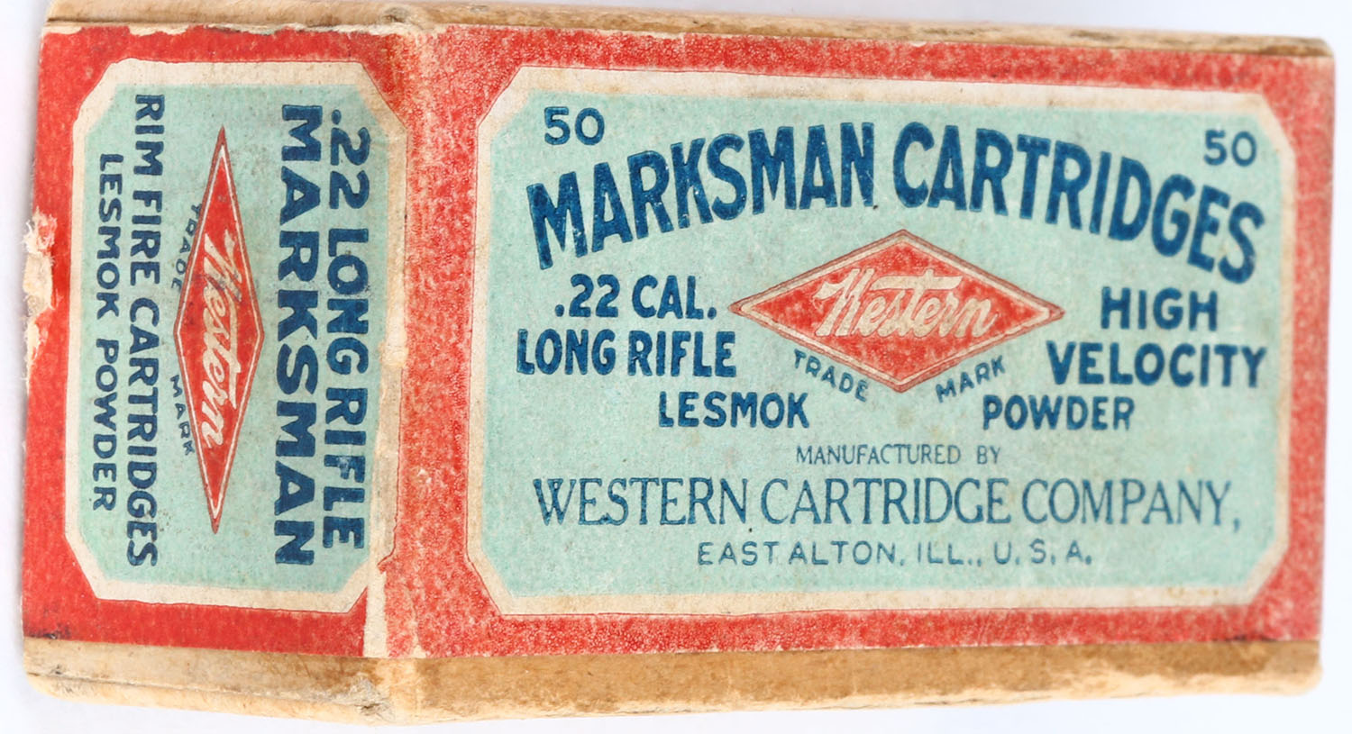 Western, Marksman Cartridges, .22 Long Rifle, High Velocity, Lesmok Powder, RHWeb: WCC-50 LR-2, Full, 2pc. Buff box with green & red wraparound label, box is solid with very good color that is somewhat faded, minor age soiling, minor shelf & edge wear, very minor corner wear, label is intact, ammo is very good. Grade: Excellent - Value: 100 to 300