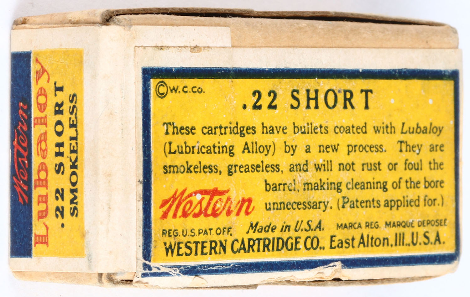 Western, .22 Short, Lubaloy Coated Bullet, RHWeb: WCC-4.2 S-1a, Full & Sealed, 2pc. Buff box with yellow blue & red wraparound label, box is solid with very good color, some age soiling, very minor shelf wear, edges are crisp, corners are mostly sharp, label is intact. Grade: Excellent + - Value: 100 to 200