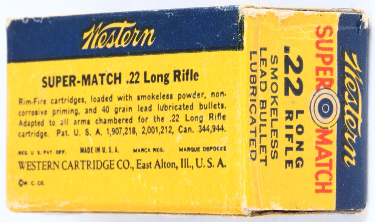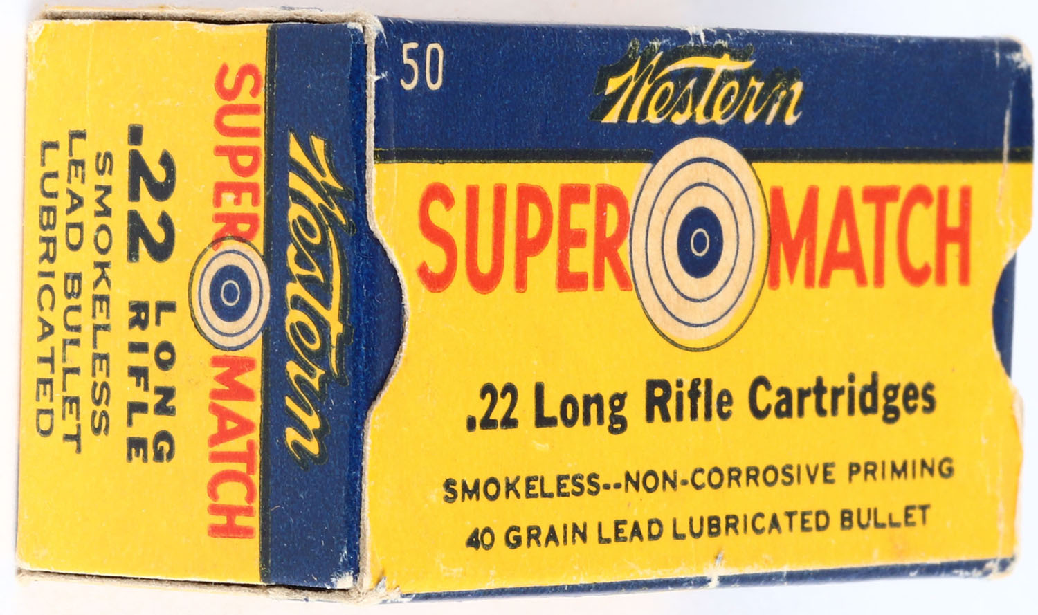Winchester, Super Match, .22 Long Rifle, RHWeb: WCC-51.1 LR-3c, Full, 1pc. Yellow blue & red box, box is solid with excellent to minty color, minor corner wear, edges are mostly crisp, end flaps are rigid, ammo is excellent. Grade: Excellent ++ - Value: 10 to 50