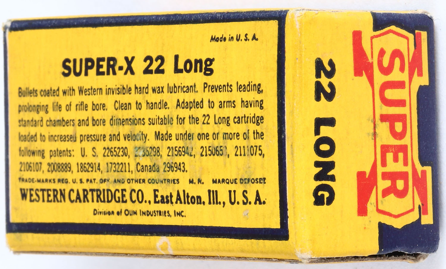 Western, Super-X, .22 Long, Extra Clean Wax Coated, RHWeb: (Super-X Longs) WCC-12 L-21, Full, 1pc. Yellow blue & red box, box is solid with excellent color, very minor age soiling & corner wear, edges are mostly crisp, end flaps are solid, ammo is excellent. Grade: Excellent + - Value: 6 to 24