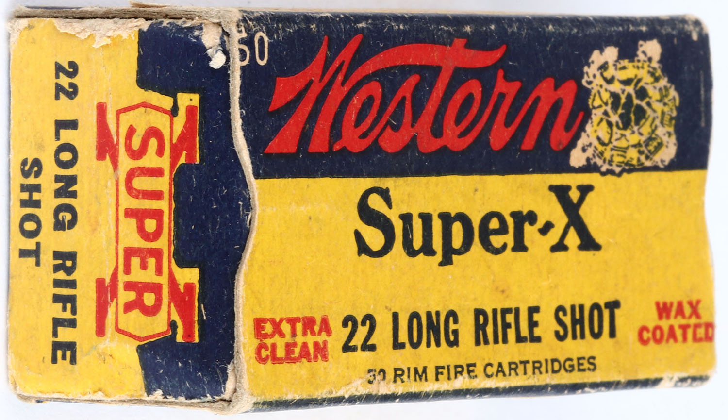 Western, Super-X, Long Rifle Shot, RHWeb: (Super-X Long Rifle) WCC-46 LRS-15, Full, 1pc. Yellow blue & red box, box is solid with excellent color, some edge & corner wear, end flaps are rigid, ammo is excellent. Grade: Excellent + - Value: 8 to 40