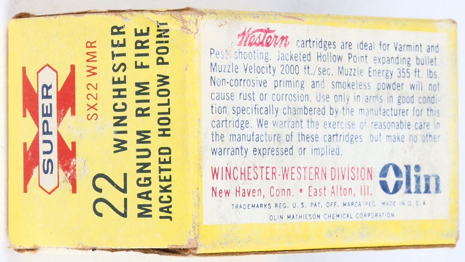 Western, Super X, .22 Winchester Magnum Rim Fire, Jacketed Hollow Point, S.A.A.M.I. Reference Ammunition, RHWeb: WCC-12 WMR-4, Full, 1pc. Yellow white & red box with white over-label, box is solid with excellent color, very minor age soiling, minor edge & corner wear, end flaps are solid, ammo is excellent to minty. Grade: Excellent + - Value: 20 to 80