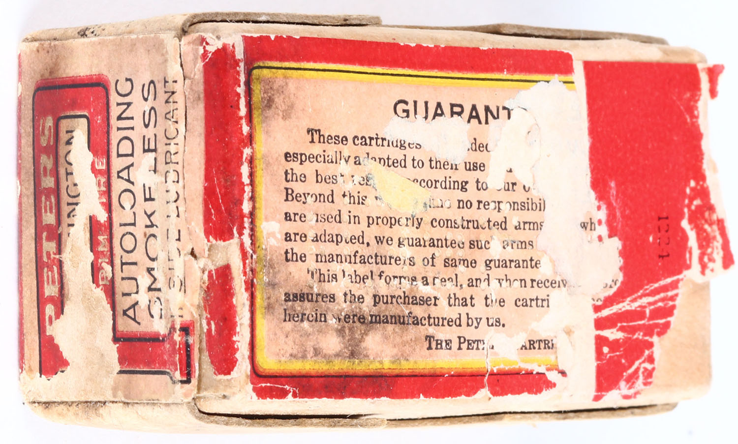 Peters, .22 Remington Autoloading Hollow Point, Smokeless R.F. Cartridges, RHWeb: PCC-5A RA-2a, Full, 2pc Buff box with salmon & red wraparound label, white over-label on top only, box is solid with good to very good color, age soiling, shelf wear, some edge & corner wear, scuffing to sides, corner of bottom label is torn, label is 90% intact, ammo is good. Grade: Very Good ++ - Value: 50 to 250