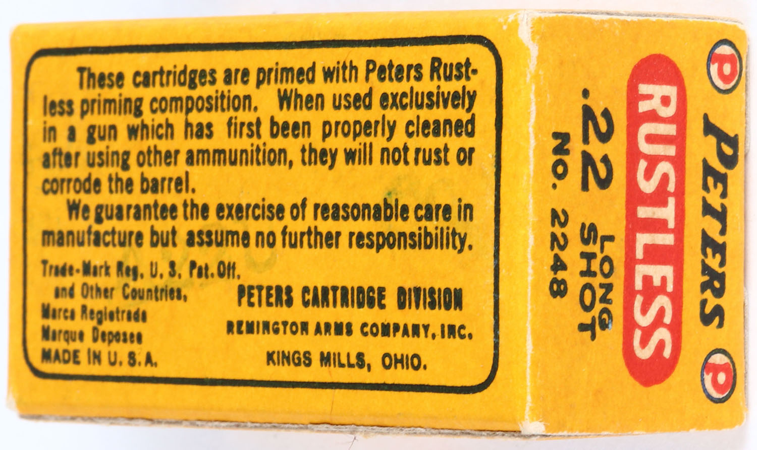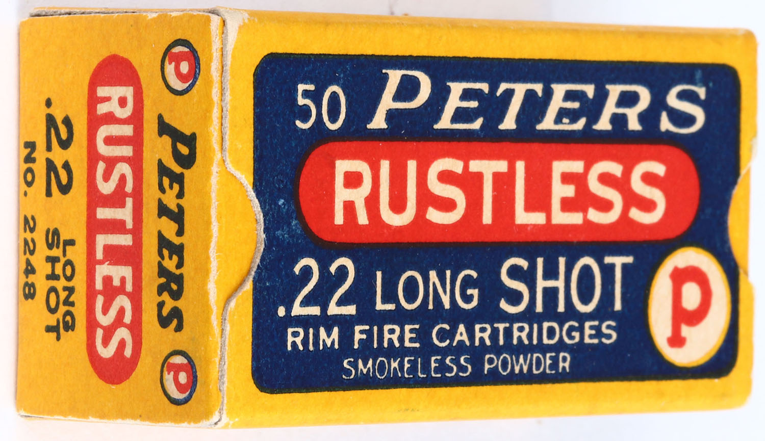 Peters, Rustless, .22 Long Shot, Smokeless Powder, RHWeb: PCC-8C L-2, Full, 1pc. Blue yellow & red box, box is very near mint with minty color, only very minor color wear on some corners, corners are still sharp, edges are crisp, end flaps are solid, ammo is excellent. Grade: MINT - Value: 150 to 300