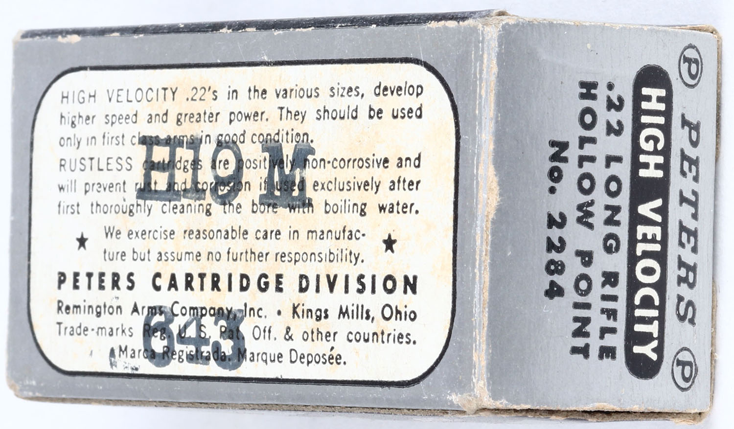 Peters, High Velocity Rustless, .22 Long Rifle Hollow Point, PCC-14 LR-2aa, Full, 1pc. Silver black & white box, box is solid with excellent color, very minor corner wear, edges are mostly crisp, end flaps are mostly rigid, ammo is excellent. Grade: Excellent + - Value: 10 to 40