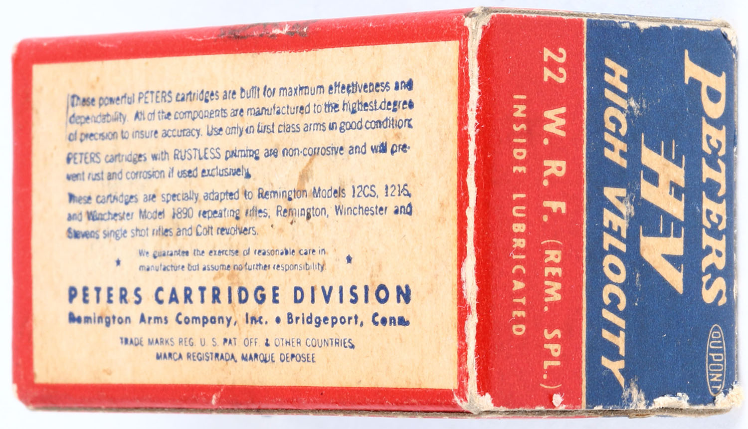 Peters, High Velocity, .22 W.R.F. (Rem. Spl.), RHWeb: PCC-17 WRF-1c, Full, 1pc. Blue red & white box, box is solid with very good color, some age soiling & corner wear, very minor edge wear, end flaps are solid, ammo is excellent. Grade: Excellent - Value: 10 to 50