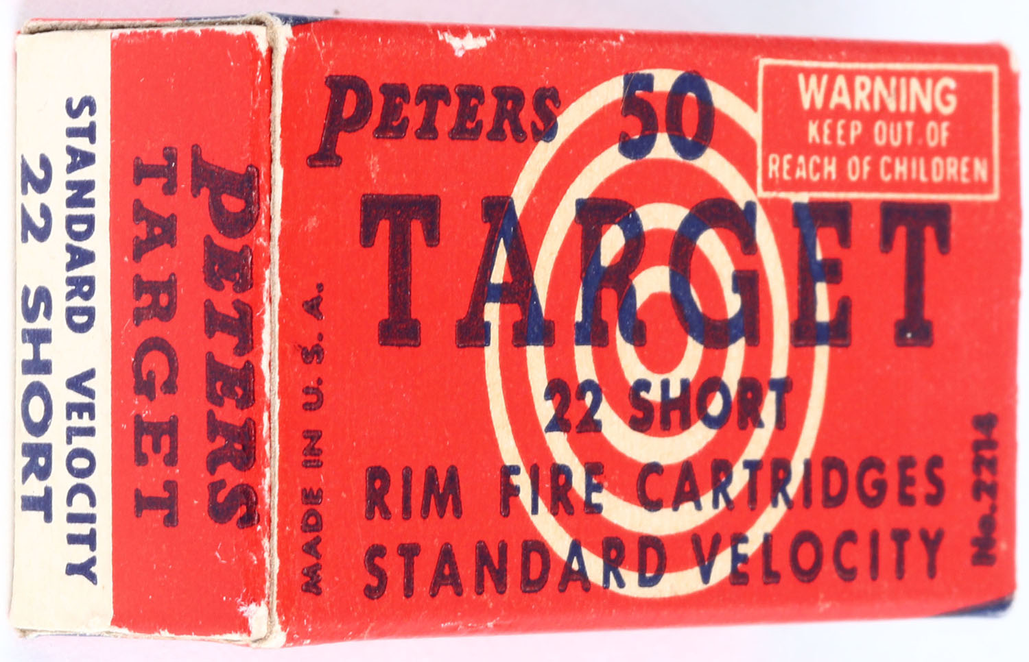 Peters, Target, .22 Short Standard Velocity, RHWeb: PCC-54D S-3, Full, 1pc. Red blue & white box, box is solid with excellent color, very minor age soiling, very minor edge & corner wear, end flaps are solid, ammo is excellent. Grade: Excellent + - Value: 4 to 20