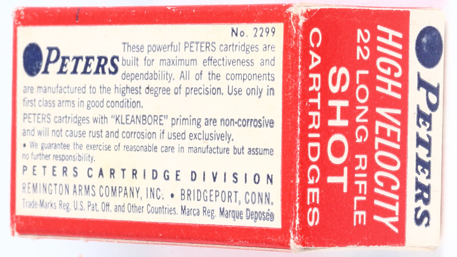 Peters, High Velocity, .22 Long Rifle Shot, RHWeb: PCC-20 LR-4b, Full, 1pc. Red white & blue box, box is solid with excellent color, very minor age soiling & corner wear, edges are crisp, end flaps are solid, ammo is excellent. Grade: Excellent + - Value: 20 to 60