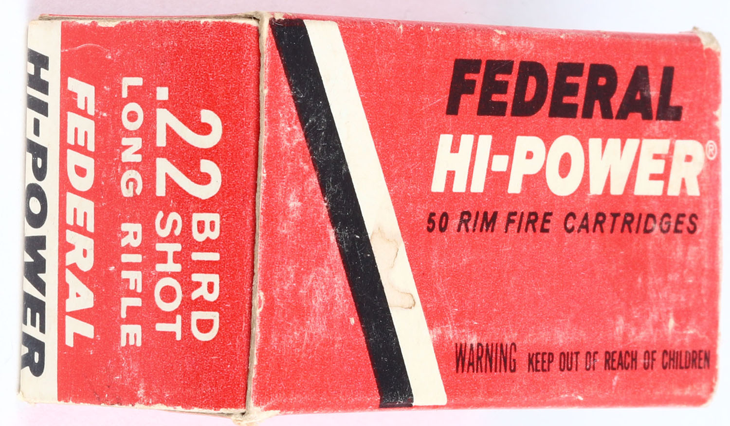 Federal, Hi-Power, .22 Long Rifle Shot, RHWeb: FED-9 LR-4b, Full, 1pc. Red white & black box, box is solid with very good color, some age soiling & shelf wear, minor corner wear, very minor edge wear, end flaps are solid, ammo is excellent. Grade: Excellent - Value: 10 to 50