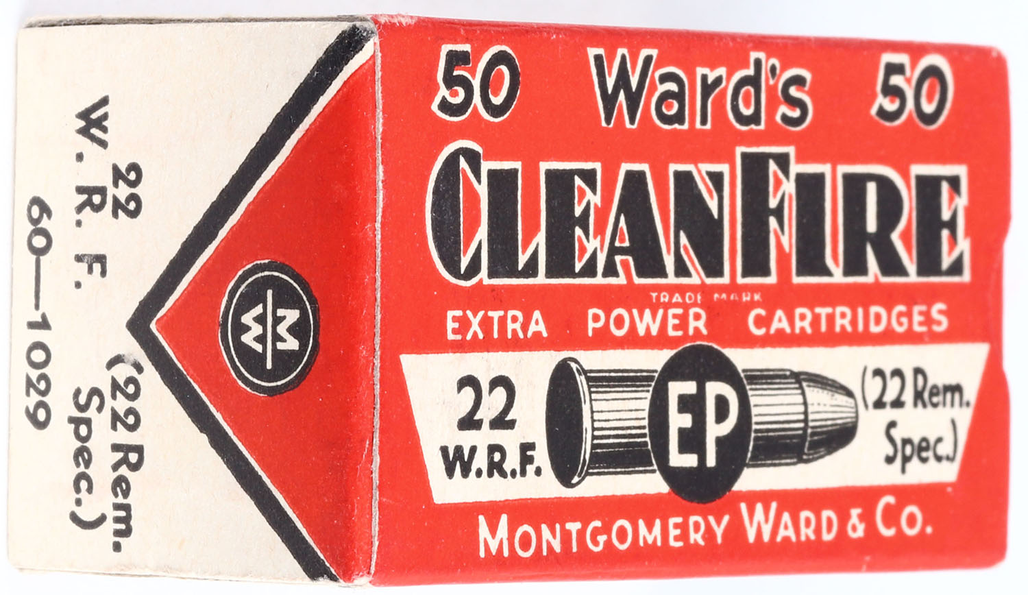 Ward's, CleanFire EP, .22 W.R.F. (.22 Rem. Spec.), RHWeb: MW-3D WRF-4b, Full, 1pc. Red white & black box, box is very near mint with excellent to minty color, only very minor age soiling on bottom and only very slight corner wear on one corner, corners are otherwise sharp, edges are crisp, end flaps are solid, ammo is excellent. Grade: Excellent ++ - Value: 40 to 200