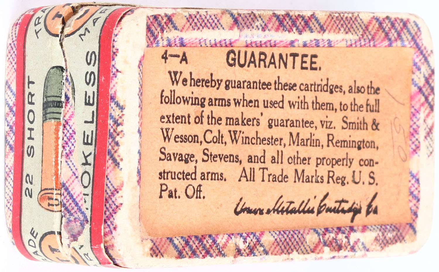 UMC, Gallery Practice, .22 Short, Smokeless, Swaged Bullets, RHWeb: UMC-10 S-1b, Full, 1pc. Purple fabric box with green & red top & side sealing labels, salmon colored bottom label, box is solid with excellent color, only very minor age soiling , minor edge wear, minor shelf wear to bottom, bottom label has been written on, label is 99% intact, ammo is very good. Grade: Excellent + - Value: 50 to 150
