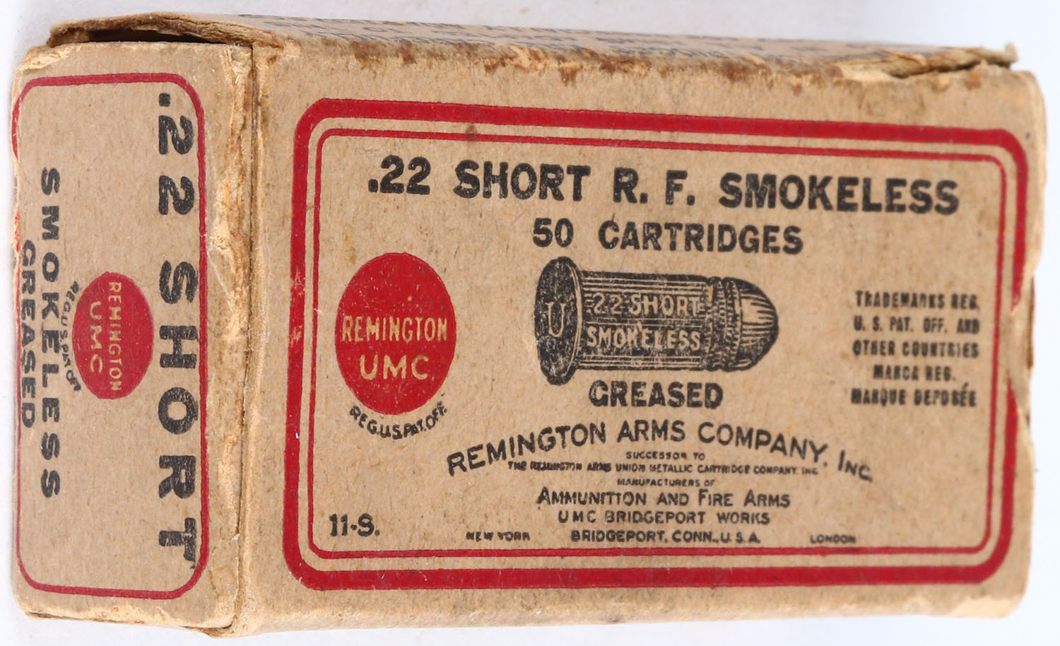 REM-UMC, .22 Short, Smokeless Greased, RHWeb: REM-5 S-4B, Full, 1pc. Buff red & gray box, box is solid with very good to excellent color, some age soiling, minor edge & corner wear, partial seam split to top back edge, end flaps are solid, ammo is very good. Grade: Excellent - Value: 40 to 120